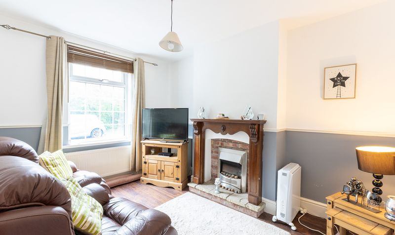 Upon entry, you’re welcomed into a bright and inviting hallway with wooden flooring and a stylish dado rail design that continues throughout the ground floor, creating a seamless sense of flow. To the front of the home is a cosy and characterful lounge, flooded with natural light from the large window. The space is centred around a beautiful feature fireplace with a traditional wooden surround and exposed brickwork, offering a warm and homely feel perfect for relaxing evenings.