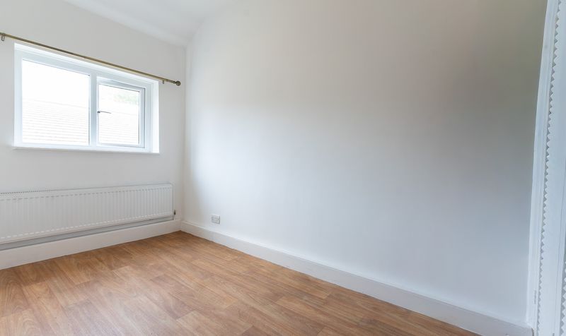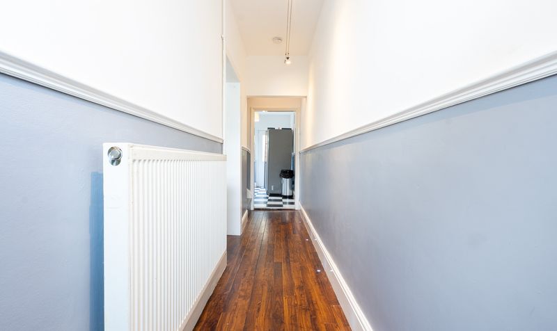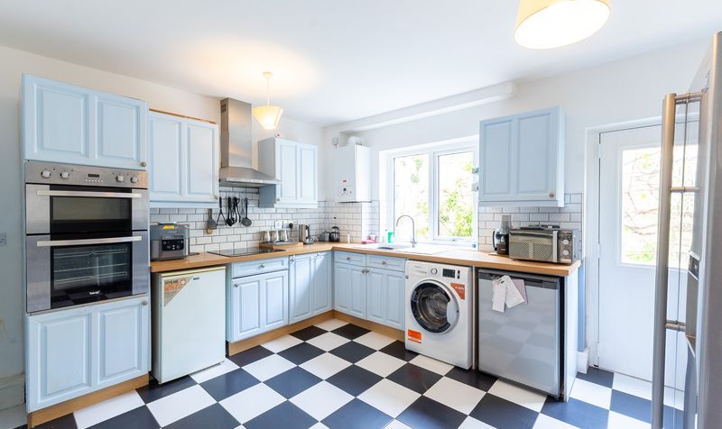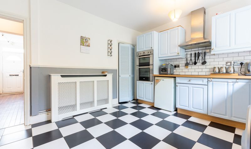 Heading towards the rear of the property, you’ll find the spacious kitchen which has been tastefully updated with a contemporary flair. The room is fitted with soft blue shaker-style cabinetry, butcher block-style worktops, and metro-tiled splashbacks. It features integrated appliances including a double oven and a sleek extractor hood, along with space for a washing machine and fridge-freezer. The bold black-and-white tiled flooring adds a striking visual appeal, while the rear window and door allow natural light to pour in, opening out to a private courtyard area-an ideal spot for a morning coffee or quiet outdoor retreat.
