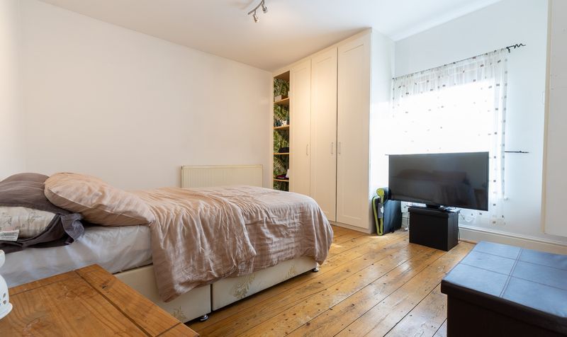 Upstairs, the accommodation continues to impress with two well-proportioned bedrooms. The principal bedroom spans the width of the property at the front, offering generous floor space, warm natural light, and built-in wardrobes, with original wooden floorboards adding further character. The second bedroom to the rear overlooks the courtyard and is ideal as a guest bedroom, nursery, or home office.