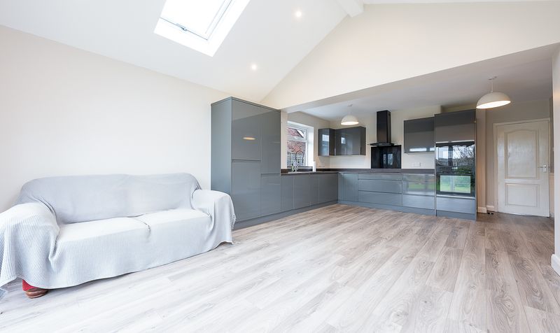 To the rear, the modern kitchen is fitted with sleek high-gloss grey cabinetry, ample worktop space and integrated appliances, including an oven and extractor hood. A window above the sink brings in additional natural light, and the layout opens beautifully into a stunning vaulted garden room extension. This impressive space features skylights, recessed lighting and full-height bi-fold doors that open directly onto the patio and lawn beyond. With its wood-effect flooring and generous proportions, this area works perfectly as a combined kitchen, dining and living space, ideal for both relaxing and entertaining.