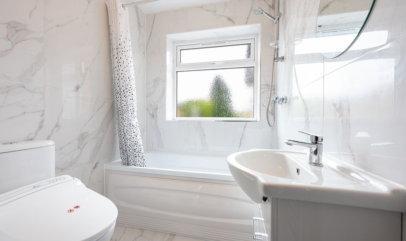 The bathroom has been stylishly updated and features contemporary marble-effect wall tiling, a modern white suite including a panelled bath with overhead shower and glass screen, wash basin and WC. A frosted window ensures privacy while allowing in natural light, completing this bright and fresh space.