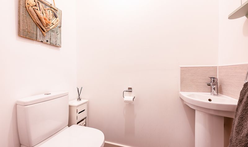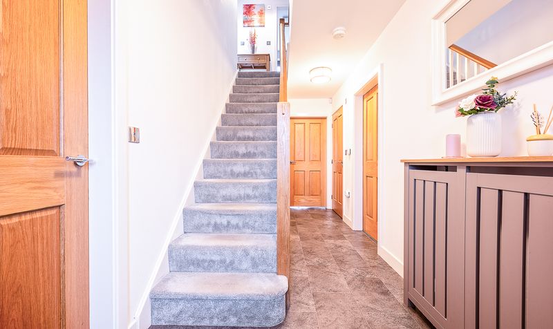 You enter the property into a welcoming entrance hallway, finished with contemporary tiled flooring and crisp décor, immediately creating a bright and airy first impression. From here, the staircase rises to the first floor and there is access to the main ground floor living spaces, along with the added benefit of a conveniently positioned ground floor WC, ideal for guests and everyday family life.
