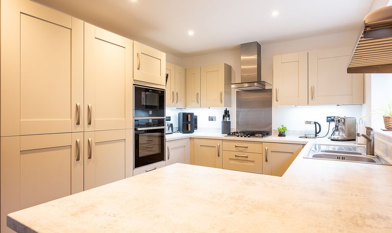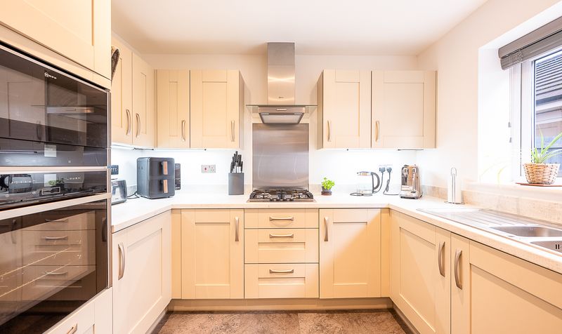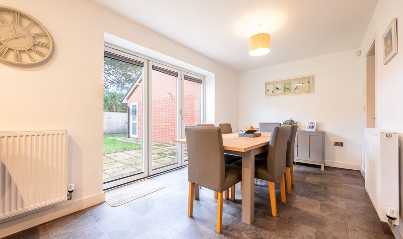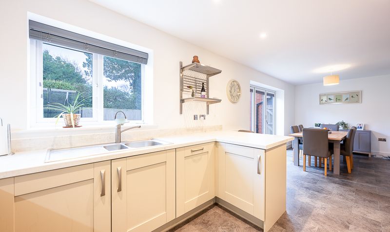 Moving through the hallway, the rear of the property opens into a superb open-plan kitchen and dining area, forming the heart of the home. The kitchen is fitted with a modern range of cream units complemented by ample worktop space and integrated appliances, creating a clean and timeless finish. A window above the sink draws in plenty of natural light, while the practical layout offers excellent functionality for everyday living. The dining area flows seamlessly from the kitchen and comfortably accommodates a family dining table, with large glazed doors opening directly onto the rear garden, making this an ideal space for entertaining and summer gatherings.