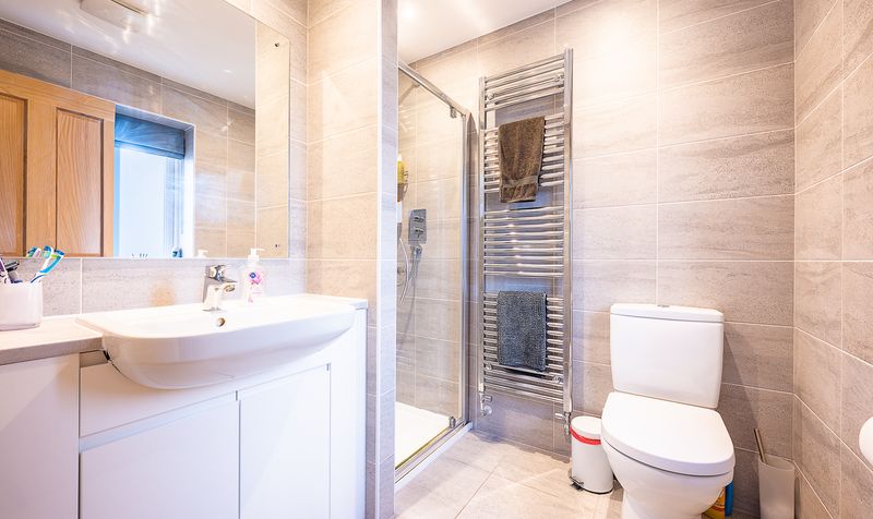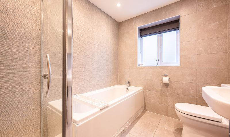 The family bathroom is a standout feature in its own right, offering a large and beautifully finished space designed with both style and practicality in mind. Fitted with a modern white suite, the bathroom comprises a bath with glass screen and shower, WC and wash basin, complemented by contemporary tiling and a bright, airy feel, making it ideal for busy family life.