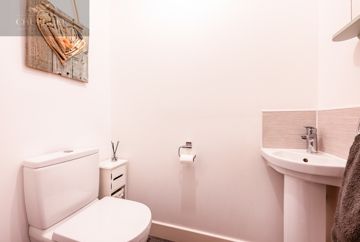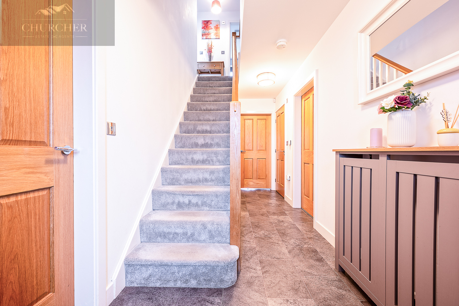 You enter the property into a welcoming entrance hallway, finished with contemporary tiled flooring and crisp décor, immediately creating a bright and airy first impression. From here, the staircase rises to the first floor and there is access to the main ground floor living spaces, along with the added benefit of a conveniently positioned ground floor WC, ideal for guests and everyday family life.