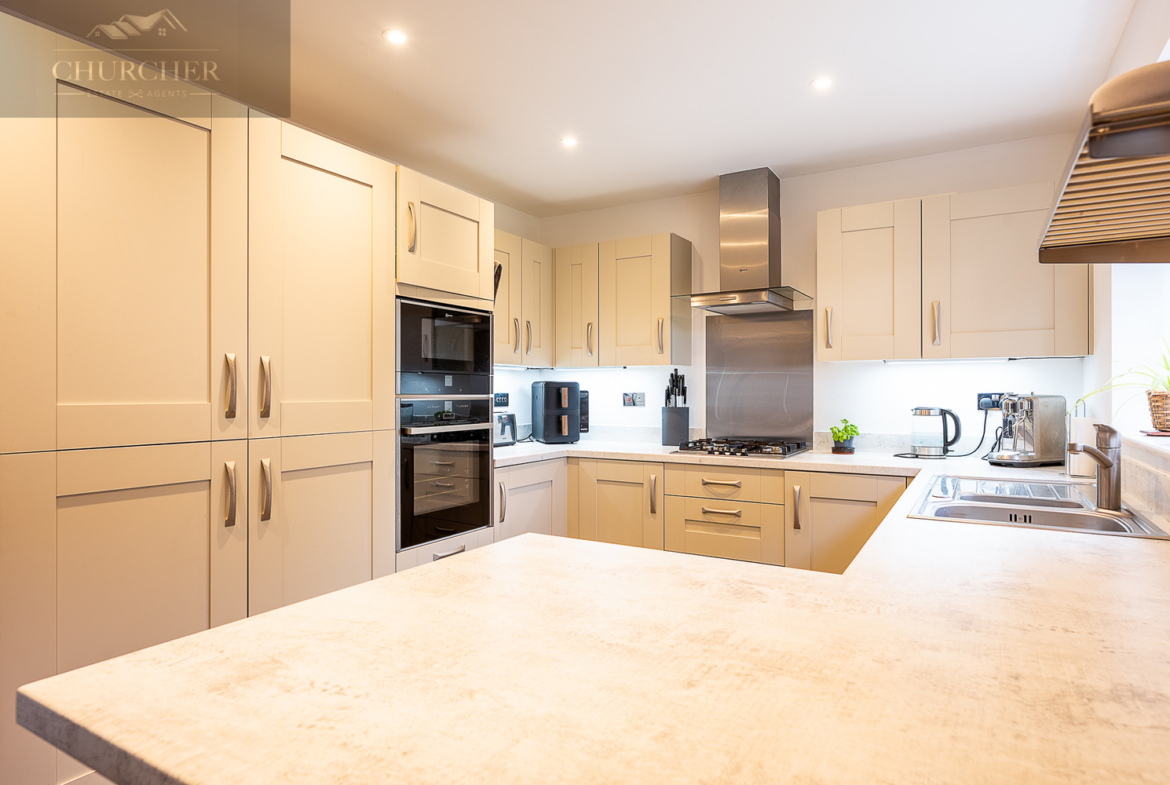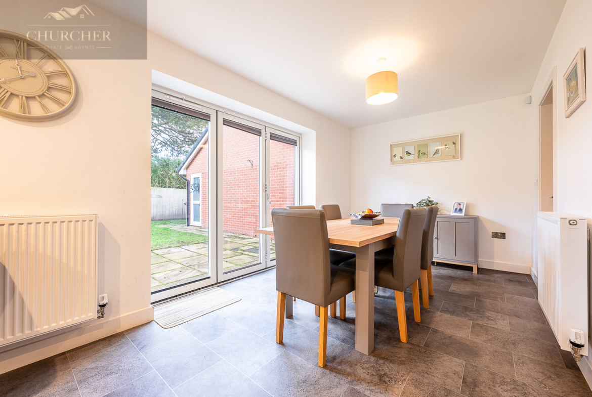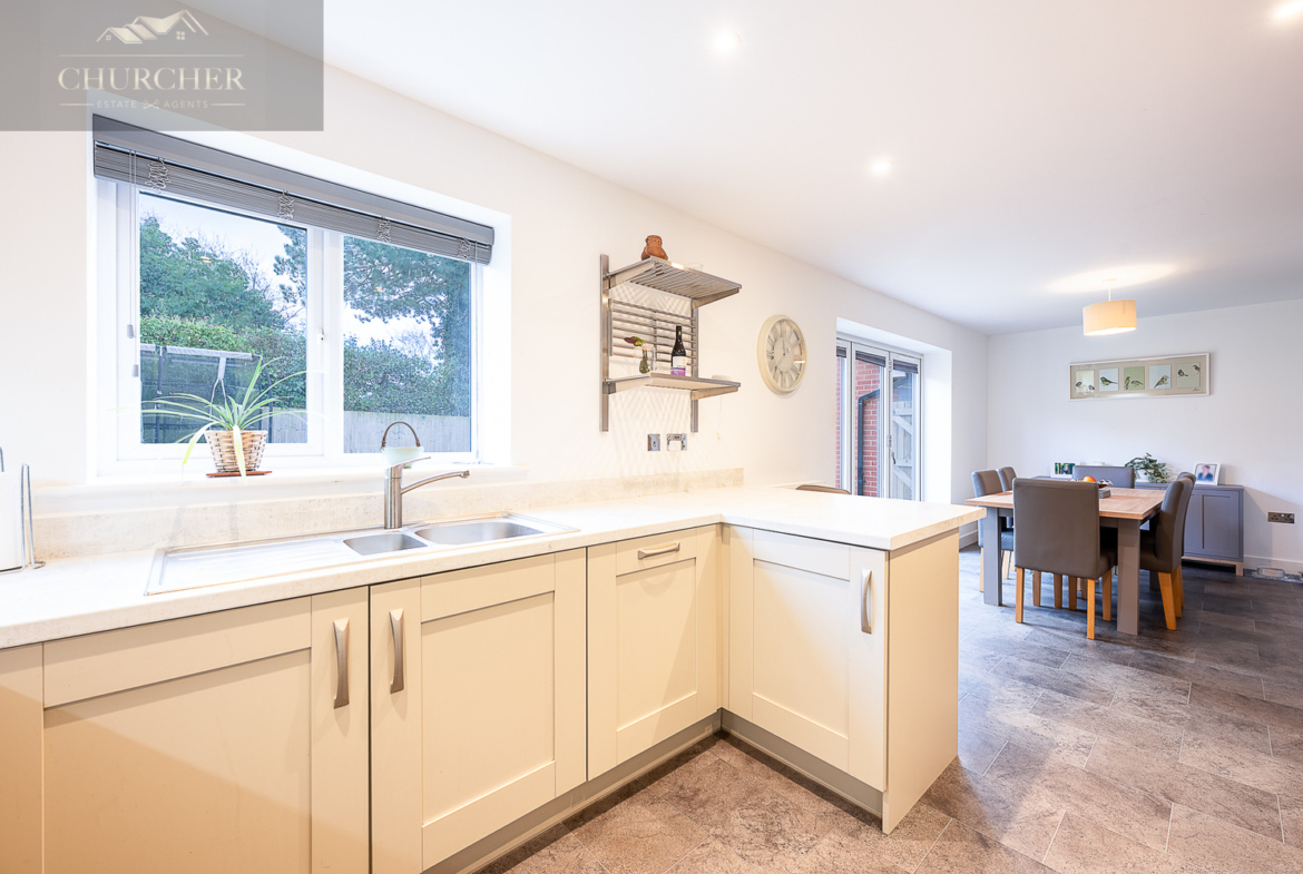 Moving through the hallway, the rear of the property opens into a superb open-plan kitchen and dining area, forming the heart of the home. The kitchen is fitted with a modern range of cream units complemented by ample worktop space and integrated appliances, creating a clean and timeless finish. A window above the sink draws in plenty of natural light, while the practical layout offers excellent functionality for everyday living. The dining area flows seamlessly from the kitchen and comfortably accommodates a family dining table, with large glazed doors opening directly onto the rear garden, making this an ideal space for entertaining and summer gatherings.