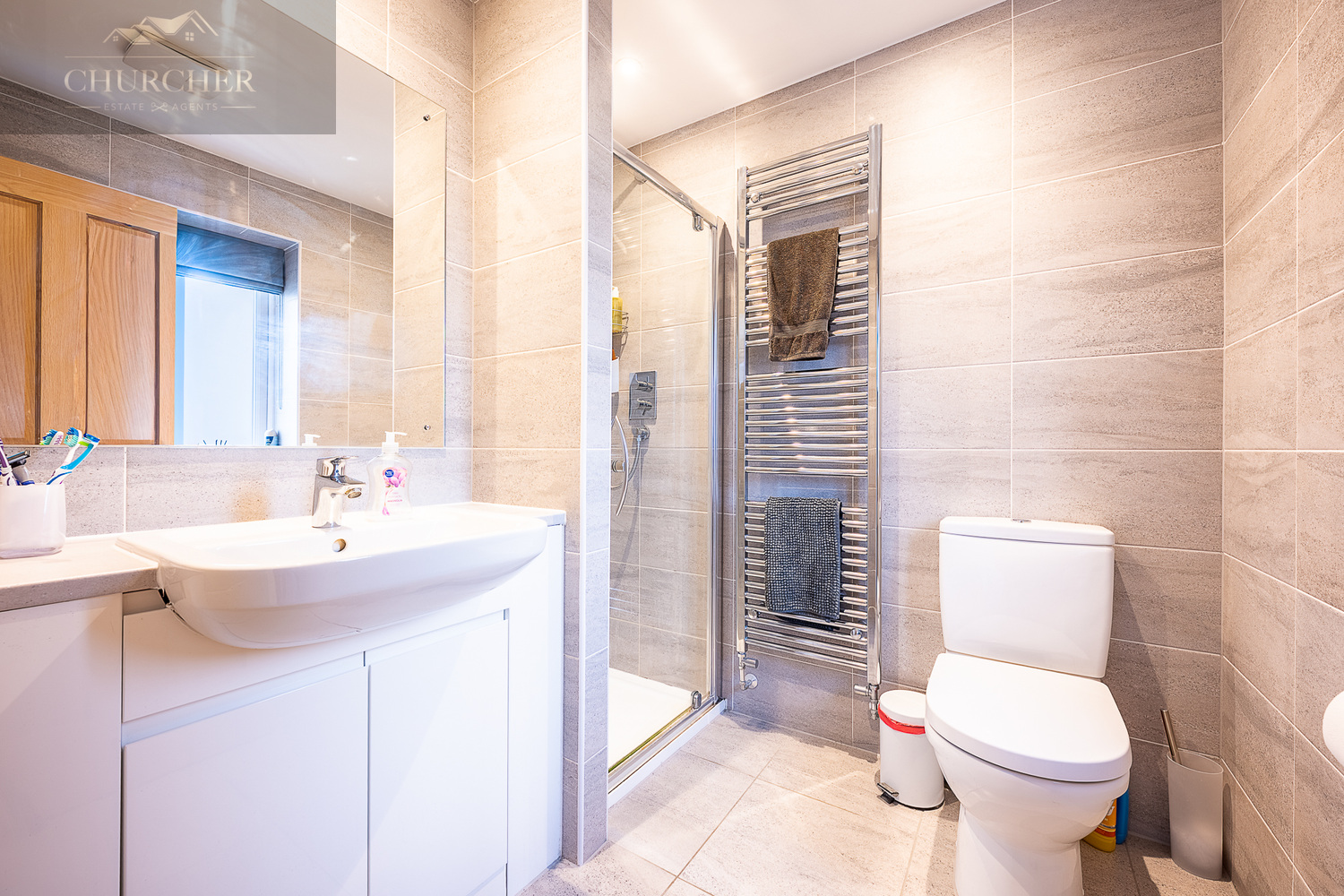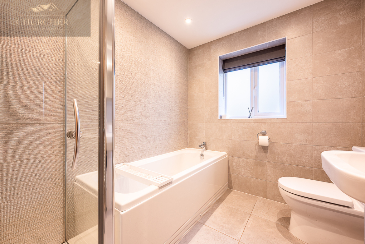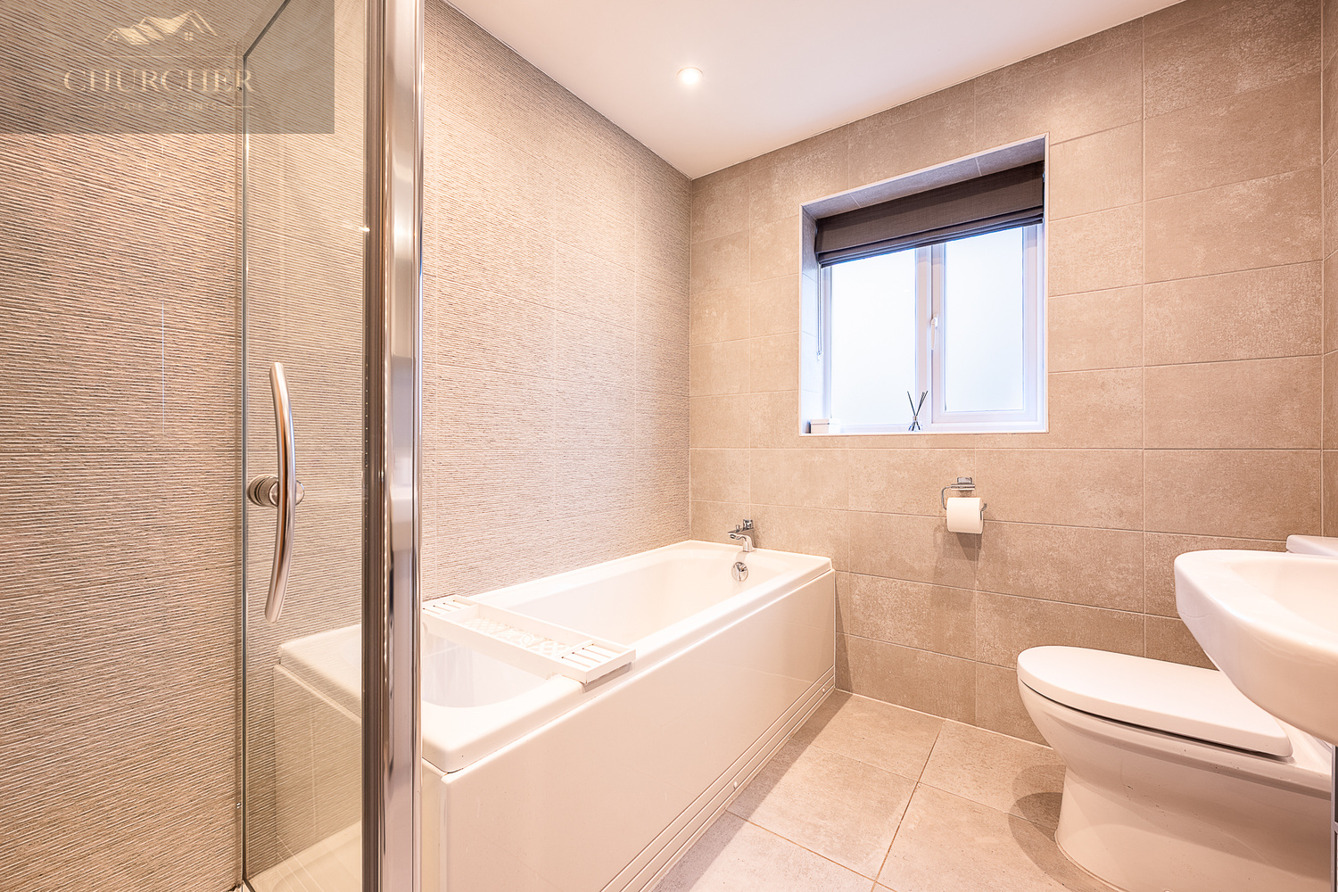 The family bathroom is a standout feature in its own right, offering a large and beautifully finished space designed with both style and practicality in mind. Fitted with a modern white suite, the bathroom comprises a bath with glass screen and shower, WC and wash basin, complemented by contemporary tiling and a bright, airy feel, making it ideal for busy family life.