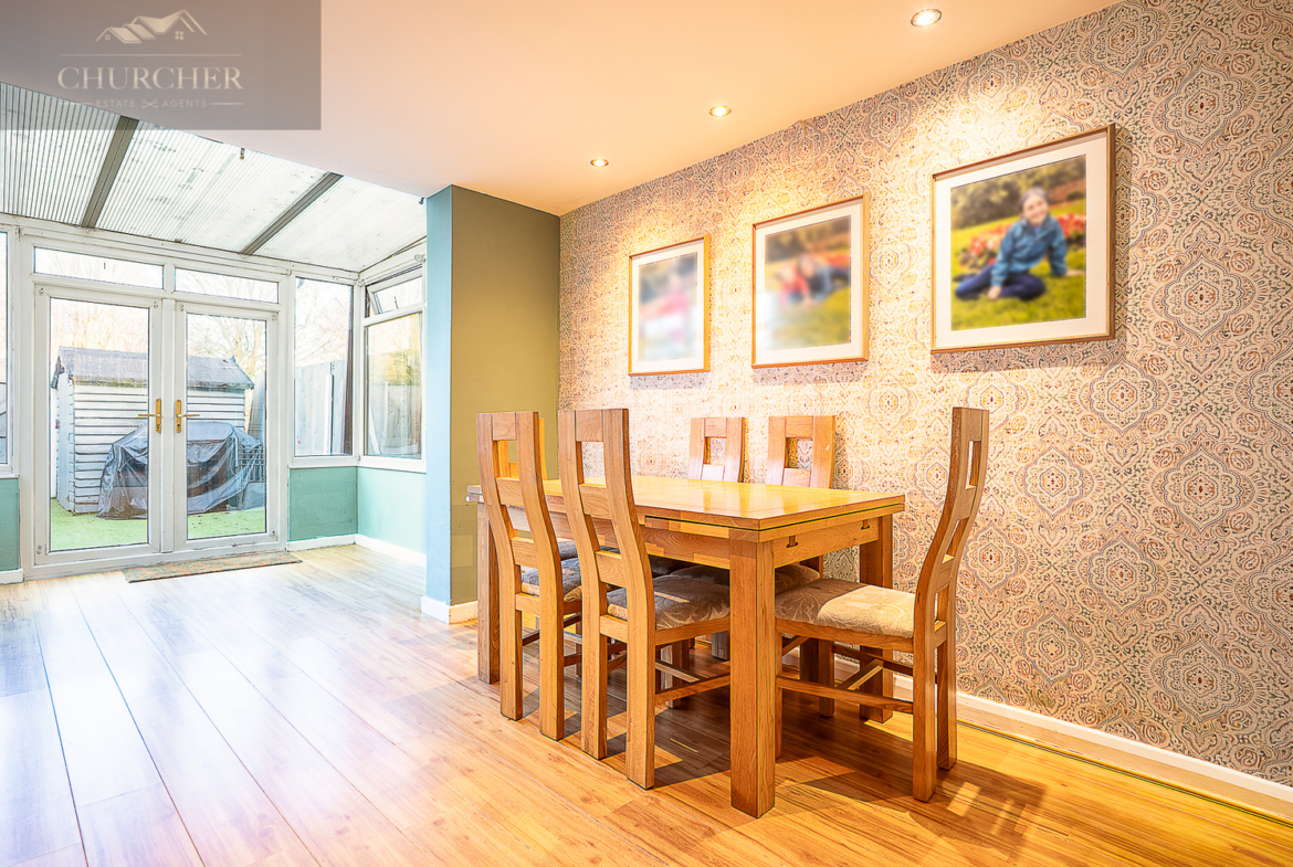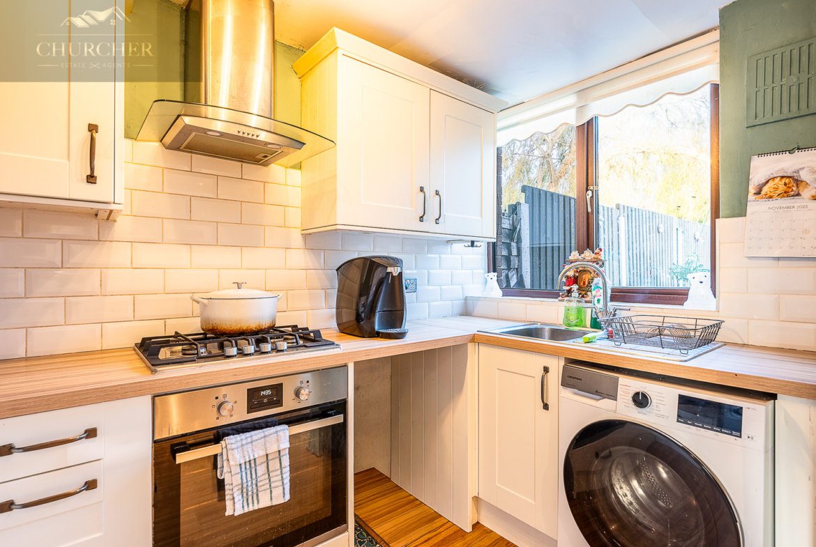 To the side of the dining room sits the modern fitted kitchen, thoughtfully designed to maximise both storage and functionality. Contemporary cabinetry provides plentiful cupboard space, while the wooden-effect worktops offer generous preparation areas. Sleek subway-style tiling adds a stylish finish, and integrated appliances ensure the space is practical as well as attractive. A window overlooking the rear garden fills the kitchen with natural light, making it a bright and enjoyable place to cook and prepare meals.