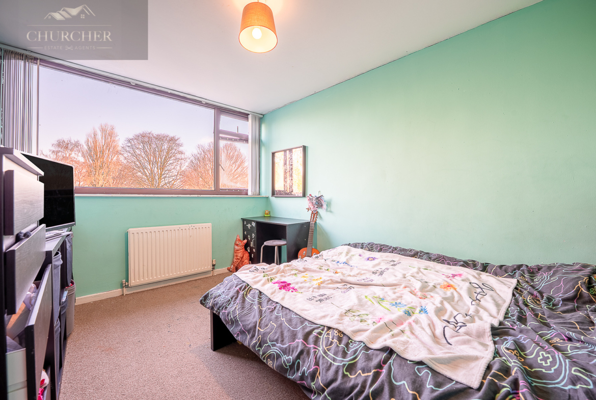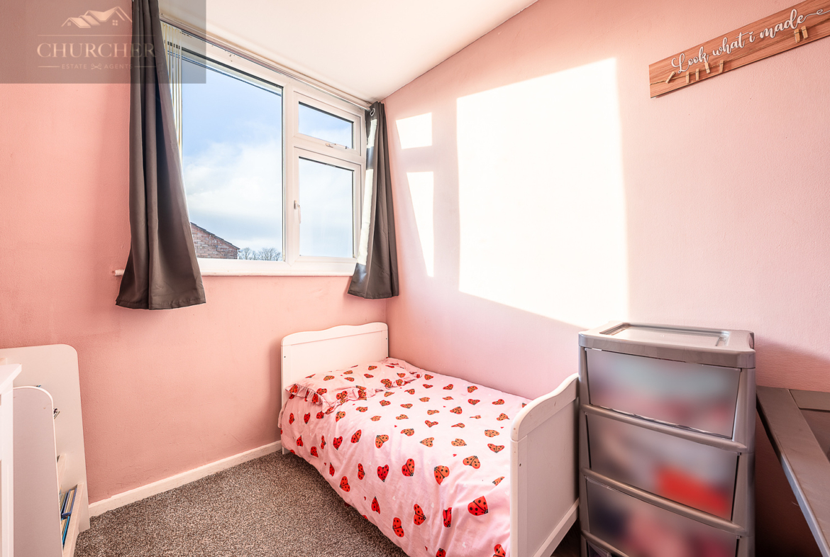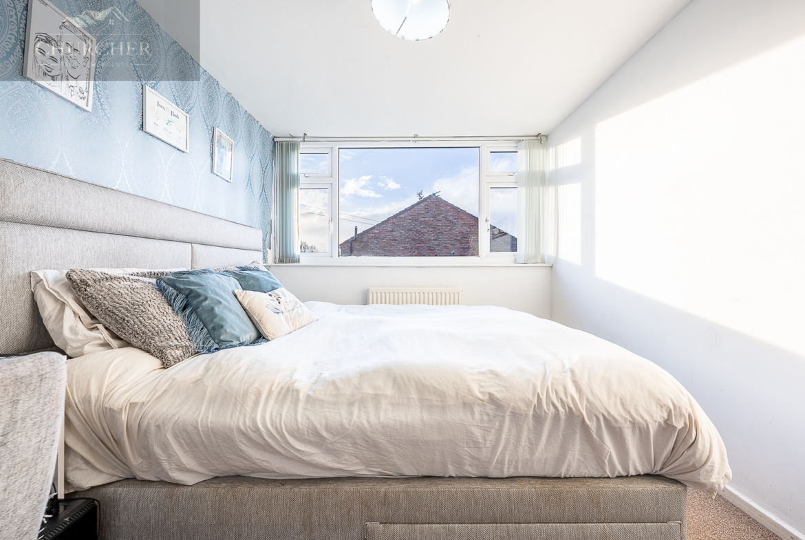 Moving upstairs, the home offers three well-proportioned bedrooms. The main bedroom sits to the front and enjoys an abundance of natural light courtesy of its wide window, creating a bright and calming atmosphere. The second double bedroom offers generous space for furniture and storage, while the third bedroom is a sizeable single, ideal as a child’s room, nursery, or hobby space.