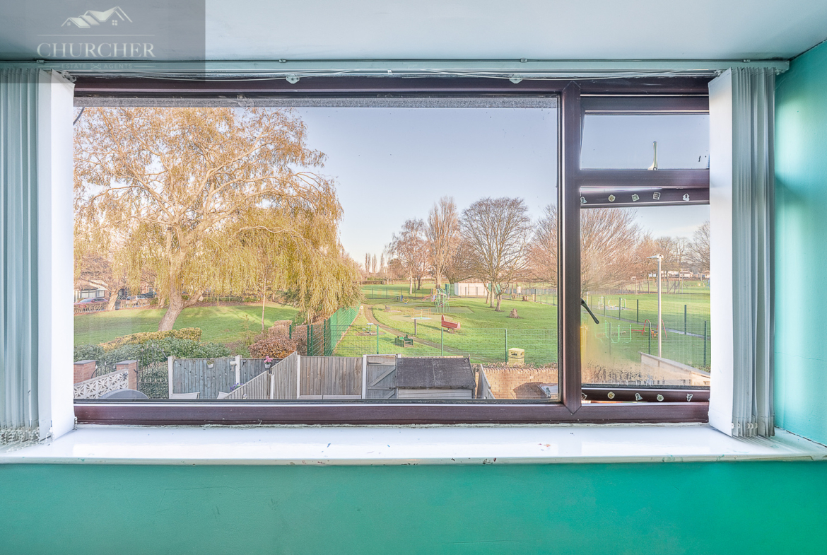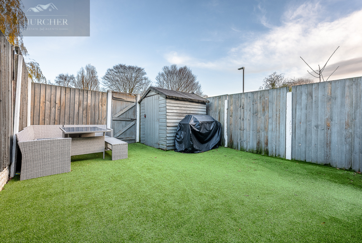 The rear garden is private, low-maintenance, and perfect for year-round enjoyment. Finished with artificial lawn, the space offers a clean and practical outdoor area ideal for children to play and for hosting gatherings. A patio-style seating area provides room for outdoor furniture, while the timber shed adds valuable storage space. Fully enclosed by fencing and with mature trees just beyond the boundary, the garden feels secure, peaceful, and wonderfully secluded.