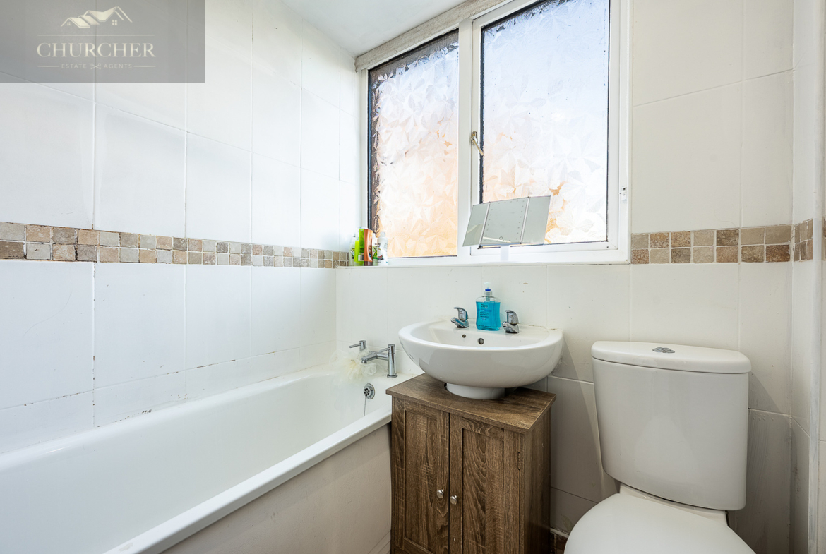 The family bathroom is positioned off the landing and is fitted with a modern white suite, including a panelled bath with shower, a wash basin set upon a vanity unit, and a WC. Frosted windows allow plenty of natural light while ensuring privacy, and neutral tiling provides a clean and contemporary finish.