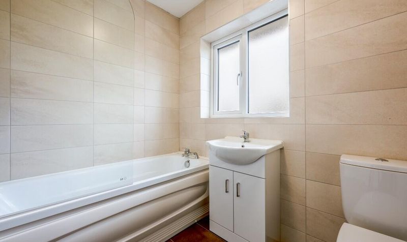 The family bathroom is fitted with a modern white three-piece suite comprising a panelled bath with shower over and glass screen, wash hand basin set within a vanity unit, and WC. Finished with contemporary tiling and a frosted window allowing for natural light while maintaining privacy, the space is both practical and well presented.