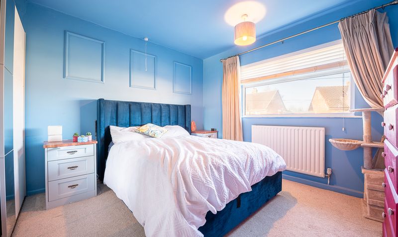 To the first floor, the property offers three well-proportioned bedrooms. The main bedroom is a beautifully styled double, finished in bold tones with plenty of space for wardrobes and further furnishings. The second bedroom, overlooking the rear garden, is another generous room with a bright and relaxed feel. The third bedroom is currently presented as a home office but also serves perfectly as a single room or nursery-ideal for those needing flexible living arrangements.
