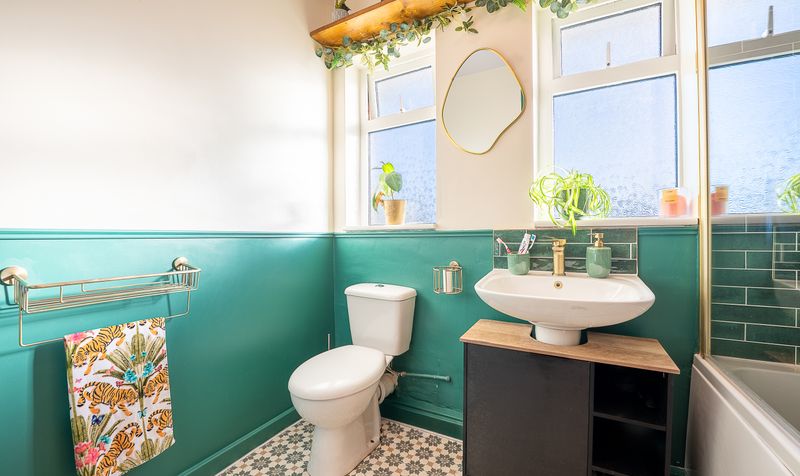 The contemporary family bathroom completes the upper floor and is finished to a high standard. With modern green tiling, a three-piece suite including a shower over the bath, feature flooring and charming decorative touches, this is a calm and stylish space to unwind.