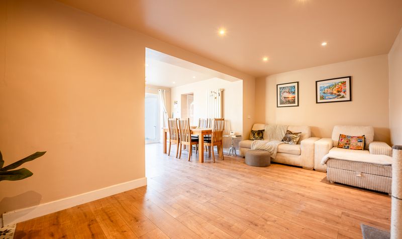 The heart of this home lies in the impressive open-plan sitting, dining and kitchen area-a thoughtfully designed space that combines style, practicality and sociable living. The sitting area offers a cosy retreat with warm tones and a stunning wood-panelled feature wall, creating a striking focal point. Continuing through, the dining space is perfectly placed for family meals and entertaining, with French doors opening directly onto the garden and allowing natural light to pour in.