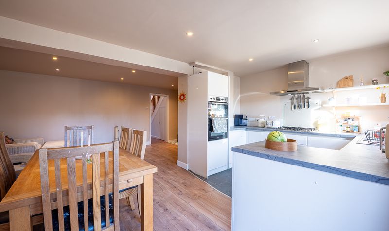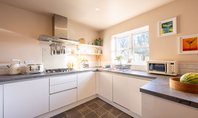 The modern kitchen is beautifully finished with sleek white cabinetry, contemporary worktops and integrated appliances. Dual aspect windows flood the room with daylight, and open shelving adds both storage and character. The layout has been carefully designed to offer excellent preparation space while keeping the space open and connected to the rest of the living area.