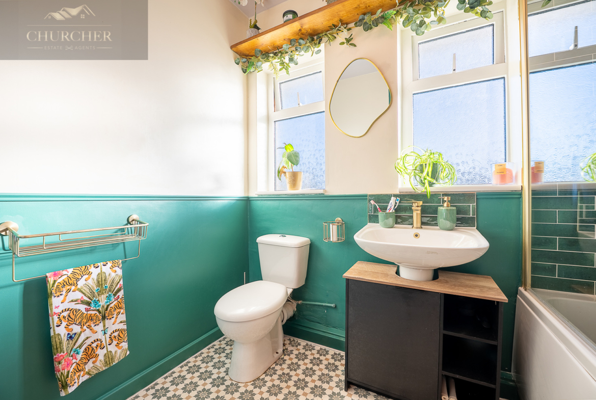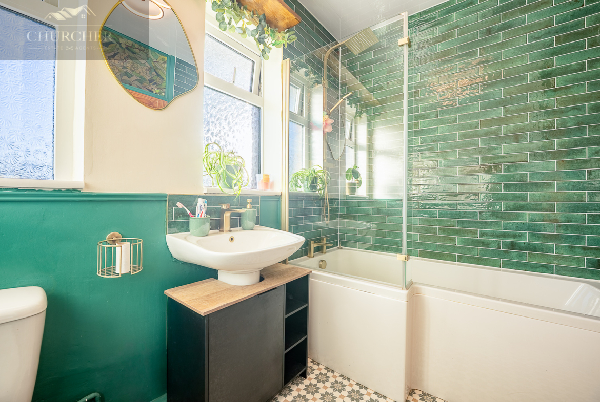 The contemporary family bathroom completes the upper floor and is finished to a high standard. With modern green tiling, a three-piece suite including a shower over the bath, feature flooring and charming decorative touches, this is a calm and stylish space to unwind.