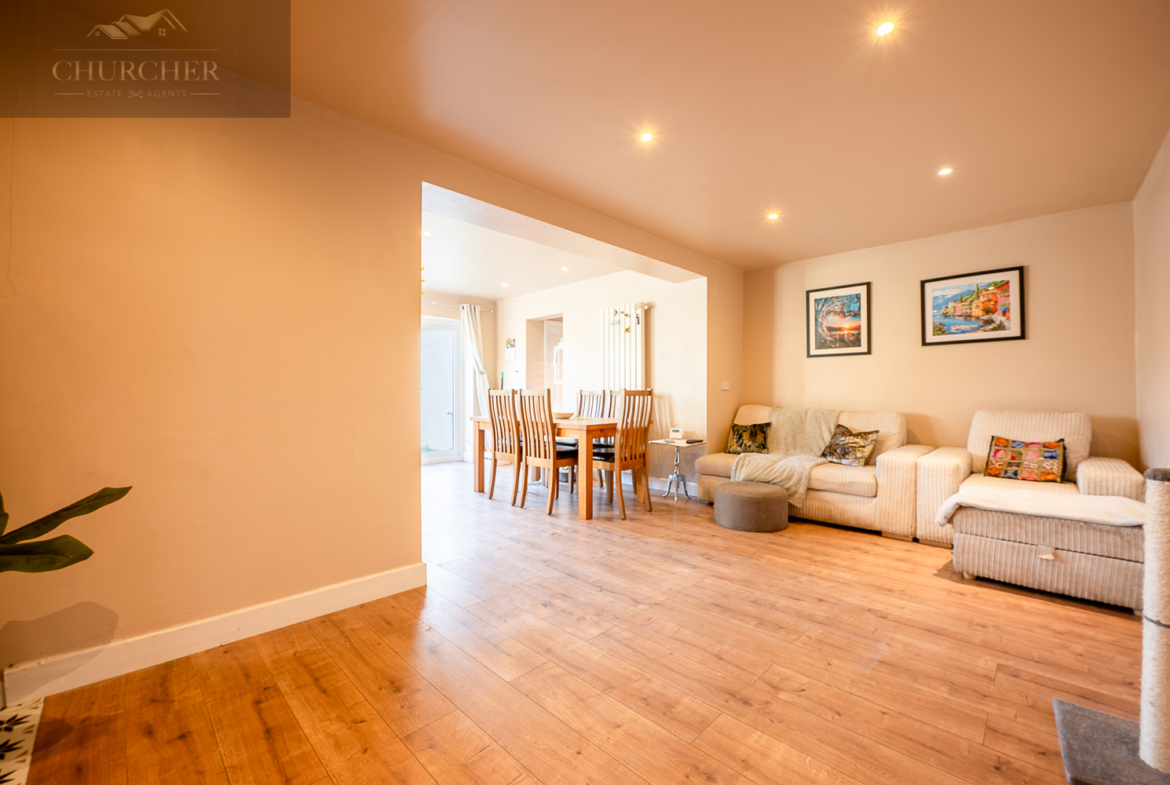The heart of this home lies in the impressive open-plan sitting, dining and kitchen area-a thoughtfully designed space that combines style, practicality and sociable living. The sitting area offers a cosy retreat with warm tones and a stunning wood-panelled feature wall, creating a striking focal point. Continuing through, the dining space is perfectly placed for family meals and entertaining, with French doors opening directly onto the garden and allowing natural light to pour in.