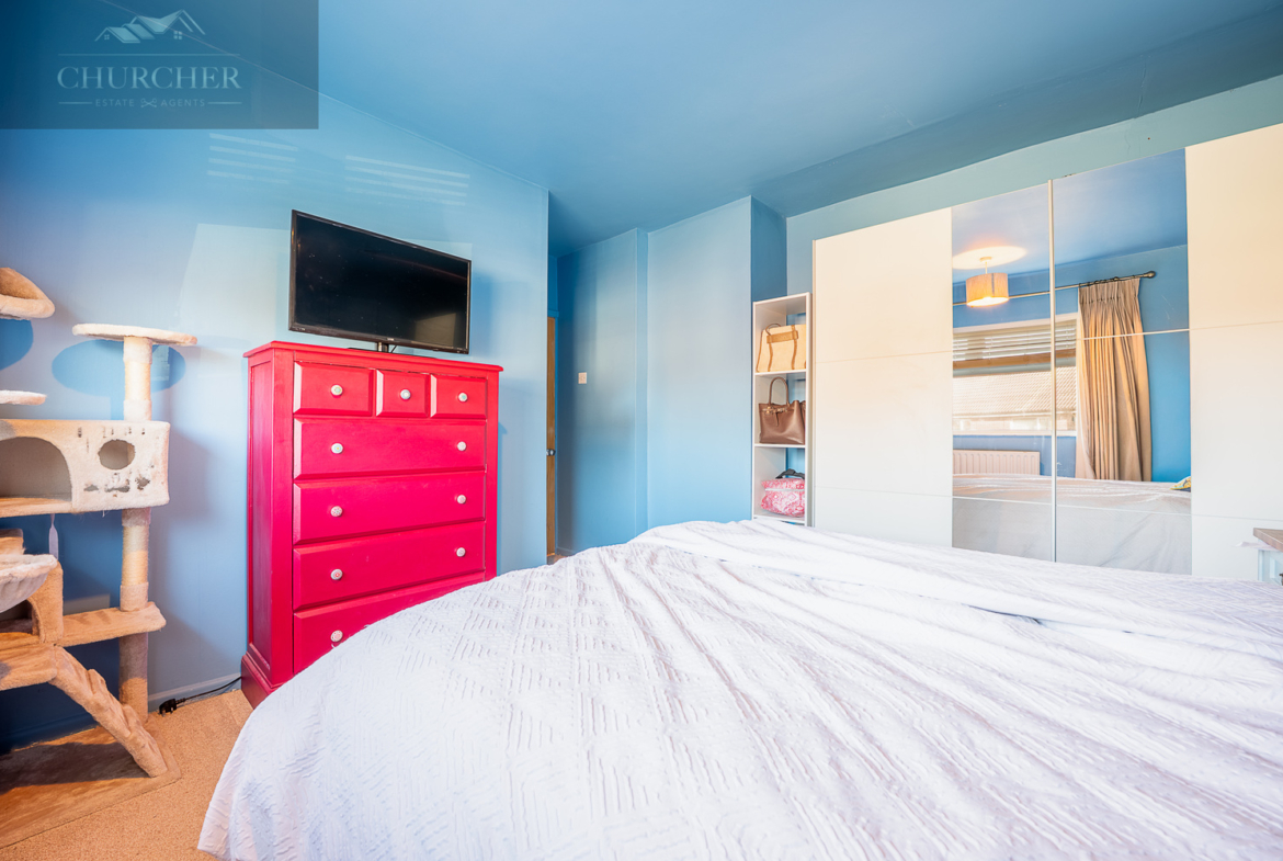 To the first floor, the property offers three well-proportioned bedrooms. The main bedroom is a beautifully styled double, finished in bold tones with plenty of space for wardrobes and further furnishings. The second bedroom, overlooking the rear garden, is another generous room with a bright and relaxed feel. The third bedroom is currently presented as a home office but also serves perfectly as a single room or nursery-ideal for those needing flexible living arrangements.