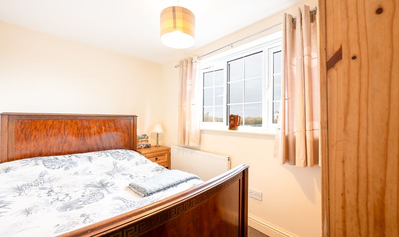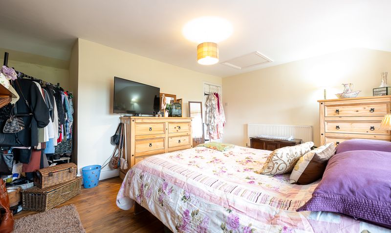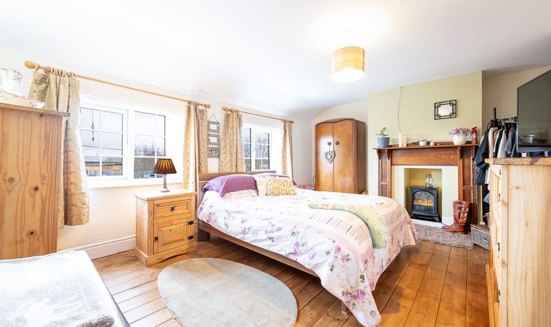 Upstairs, the property offers three bedrooms. The main bedroom is a particularly impressive space, featuring wooden flooring and a charming fireplace with a feature surround, creating a warm and characterful atmosphere. Multiple windows allow for plenty of natural light and provide pleasant views of the surrounding countryside, while the room easily accommodates a double bed along with additional furniture and storage.