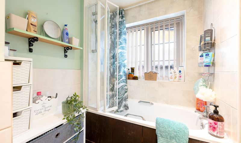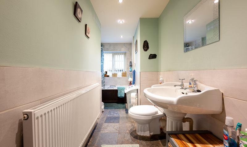 The family bathroom is spacious and well presented, featuring a bath with overhead shower, pedestal wash basin and WC. The room is finished with tiled walls and flooring and benefits from natural light from the window, creating a bright and practical space.
