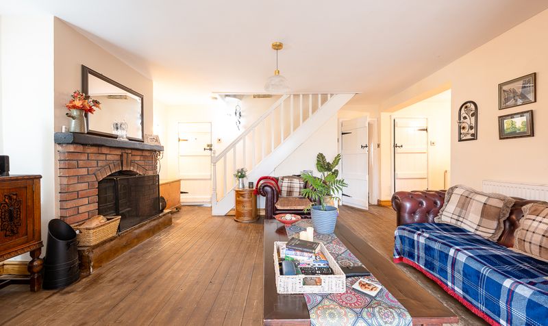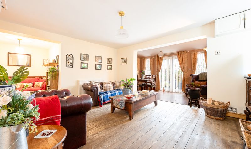 The property opens into a spacious and character-filled lounge which immediately sets the tone for the home. With attractive wooden flooring running throughout and a traditional brick fireplace with log-burning stove creating a warm focal point, the room provides a welcoming space for relaxing or entertaining. The open staircase adds character to the room, while the generous proportions allow for multiple seating areas and a comfortable family living environment.