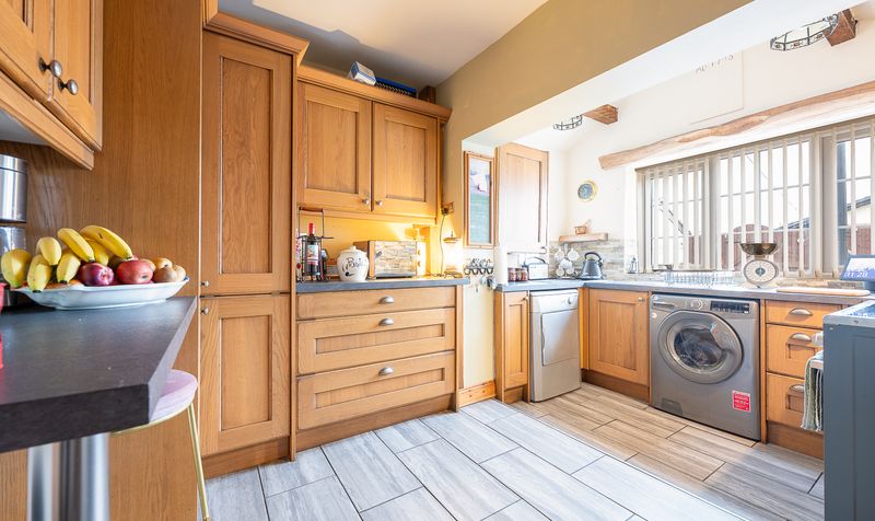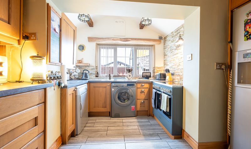 The kitchen is fitted with a range of solid wood wall and base units complemented by generous worktop space and room for appliances. The layout is both practical and inviting, with tiled flooring, charming exposed beam detailing and feature stone-style splashbacks adding further character. A window above the sink provides a pleasant outlook towards the courtyard.