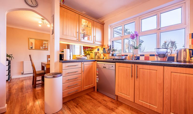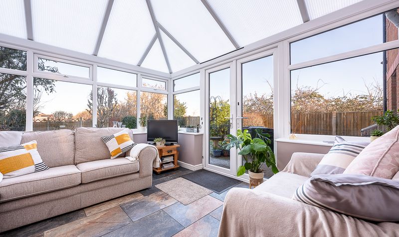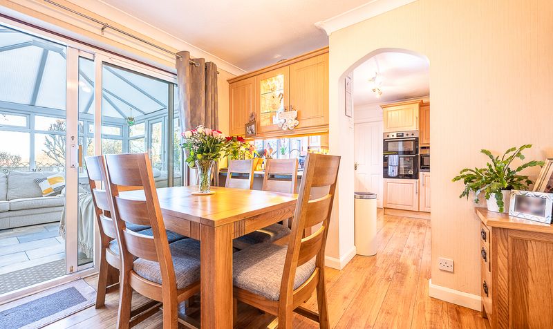 The dining room enjoys plenty of space for a family dining table and benefits from sliding patio doors that open directly into the conservatory. The conservatory is a lovely addition, flooded with natural light and offering views across the rear garden. With tiled flooring and direct access outside, it provides a versatile space suitable for use as a sitting area, garden room or additional entertaining space throughout much of the year.