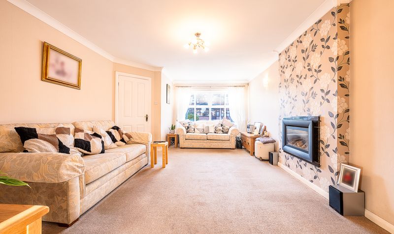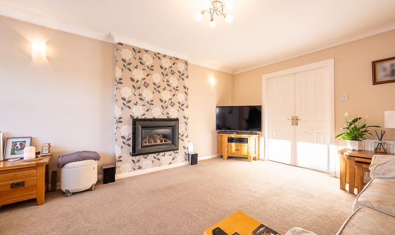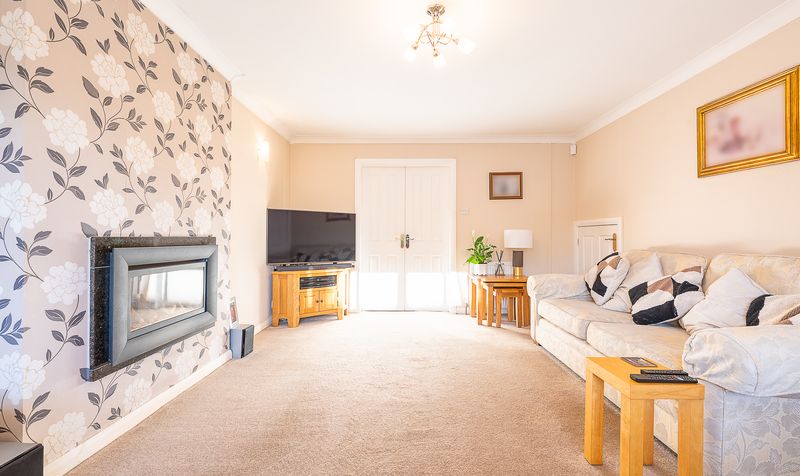 To the front of the home sits a spacious living room, a warm and comfortable space ideal for relaxing or entertaining. This room is centred around a contemporary inset gas fire set within a feature chimney breast, complemented by tasteful décor and soft carpeting. Double internal doors open into the dining room, allowing the two spaces to flow effortlessly while also offering the option to separate them when desired.