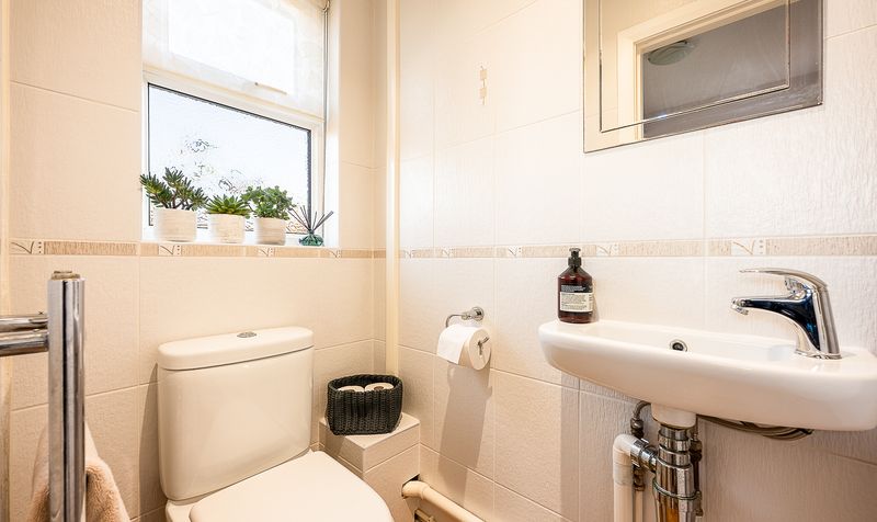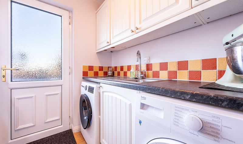 Leading on from the dining room, the kitchen is fitted with a range of well-crafted wall and base units, complemented by contrasting work surfaces and tiled splashbacks. Integrated appliances and a pleasant outlook to the rear make this a practical yet welcoming environment for day-to-day cooking. An open archway enhances the sense of space and connection to the dining area. From the kitchen, a door leads into the utility room, which offers further storage, worktop space and plumbing for laundry appliances. The utility room also provides access to a ground floor WC and a door into the integral garage, making this area particularly functional for busy family life.