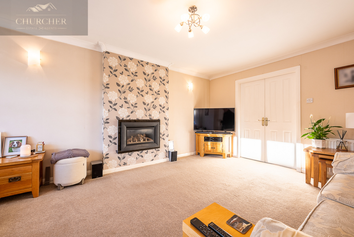 To the front of the home sits a spacious living room, a warm and comfortable space ideal for relaxing or entertaining. This room is centred around a contemporary inset gas fire set within a feature chimney breast, complemented by tasteful décor and soft carpeting. Double internal doors open into the dining room, allowing the two spaces to flow effortlessly while also offering the option to separate them when desired.