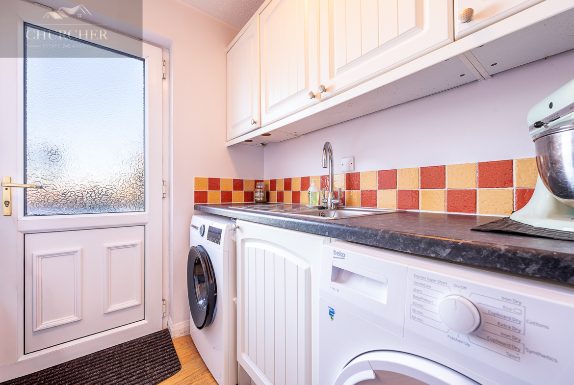 Leading on from the dining room, the kitchen is fitted with a range of well-crafted wall and base units, complemented by contrasting work surfaces and tiled splashbacks. Integrated appliances and a pleasant outlook to the rear make this a practical yet welcoming environment for day-to-day cooking. An open archway enhances the sense of space and connection to the dining area. From the kitchen, a door leads into the utility room, which offers further storage, worktop space and plumbing for laundry appliances. The utility room also provides access to a ground floor WC and a door into the integral garage, making this area particularly functional for busy family life.