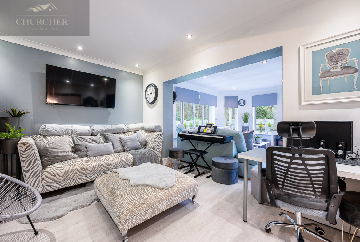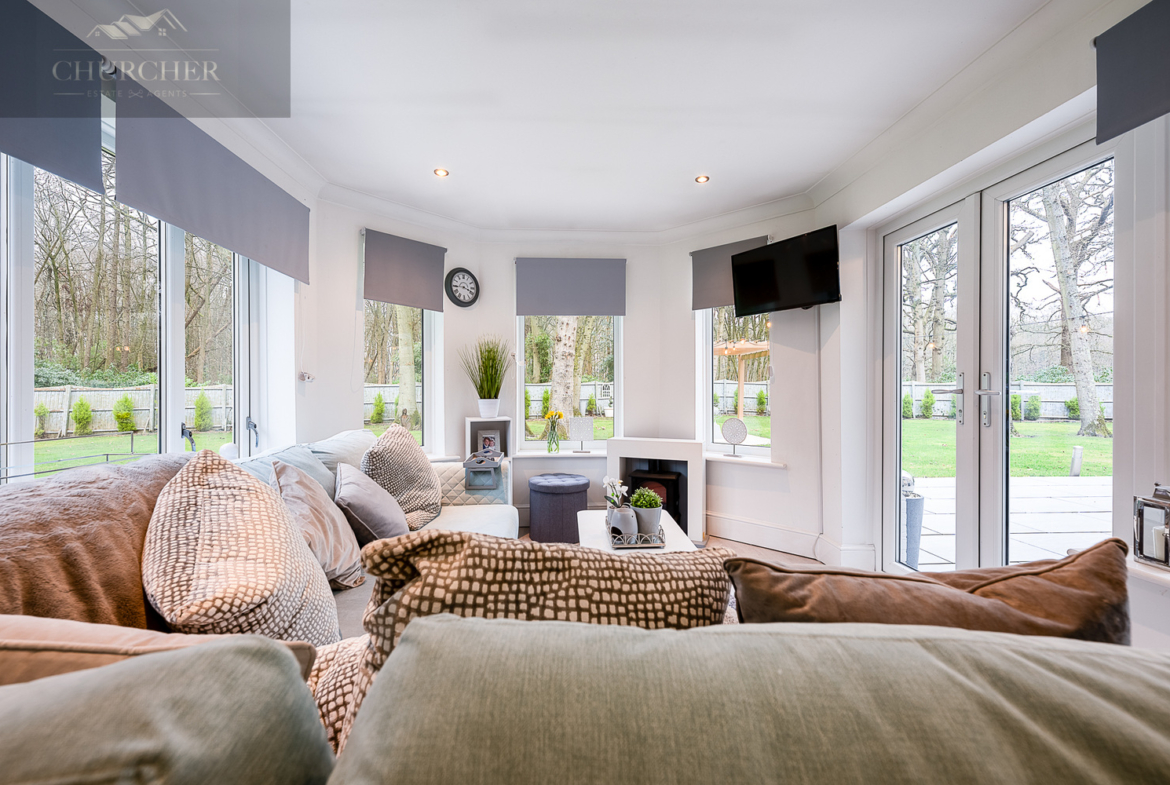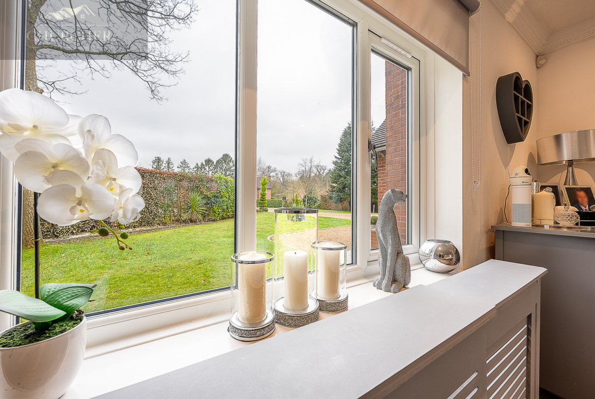Beyond the kitchen, the property further benefits from a superb garden room positioned to take full advantage of the tranquil outlook. Surrounded by glazing and filled with natural light, this impressive space offers exceptional versatility and is currently arranged as a relaxed sitting area with direct views across the lawn and mature trees beyond. With French doors opening onto the patio, it provides an ideal environment for entertaining, hobbies, or simply enjoying the peaceful surroundings throughout the year.