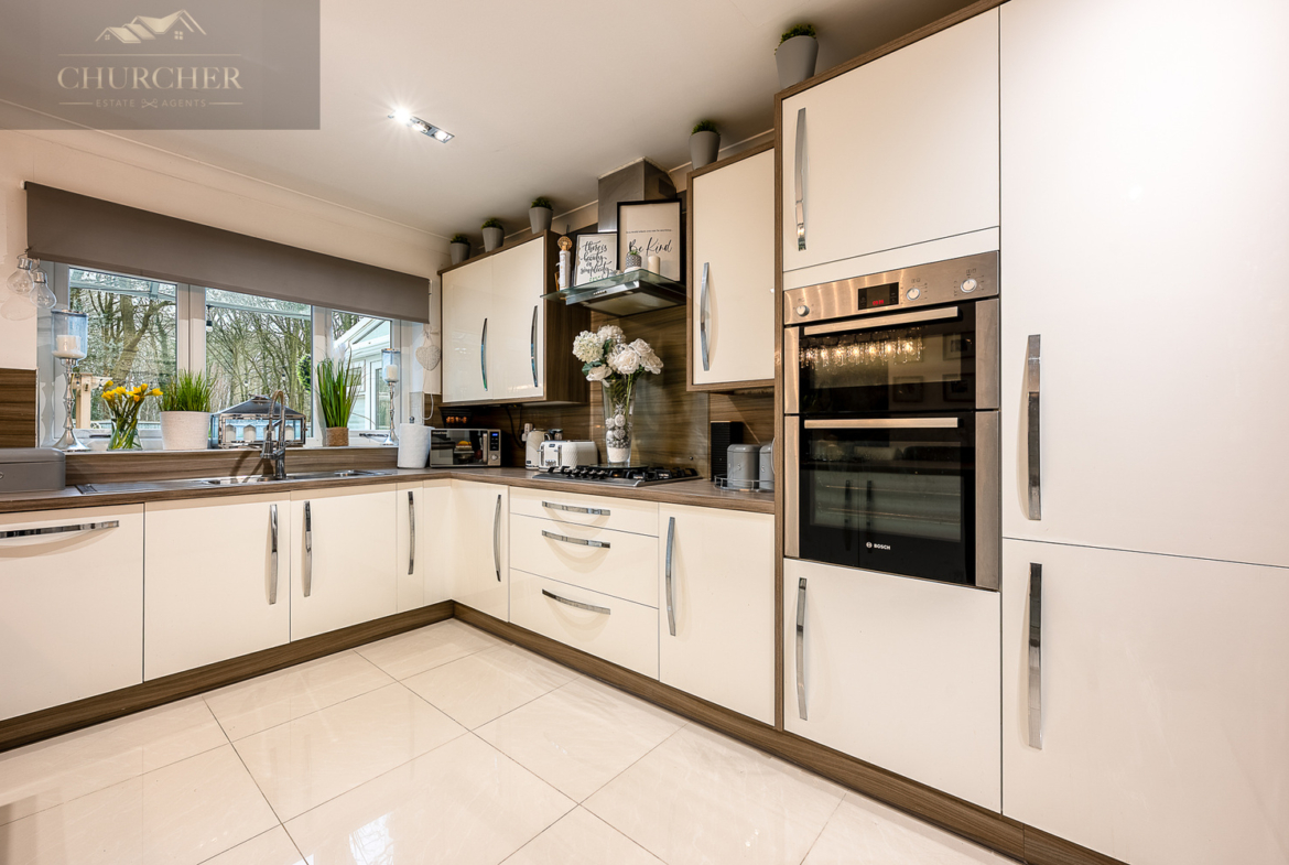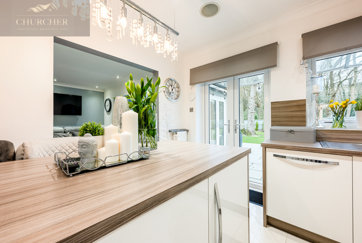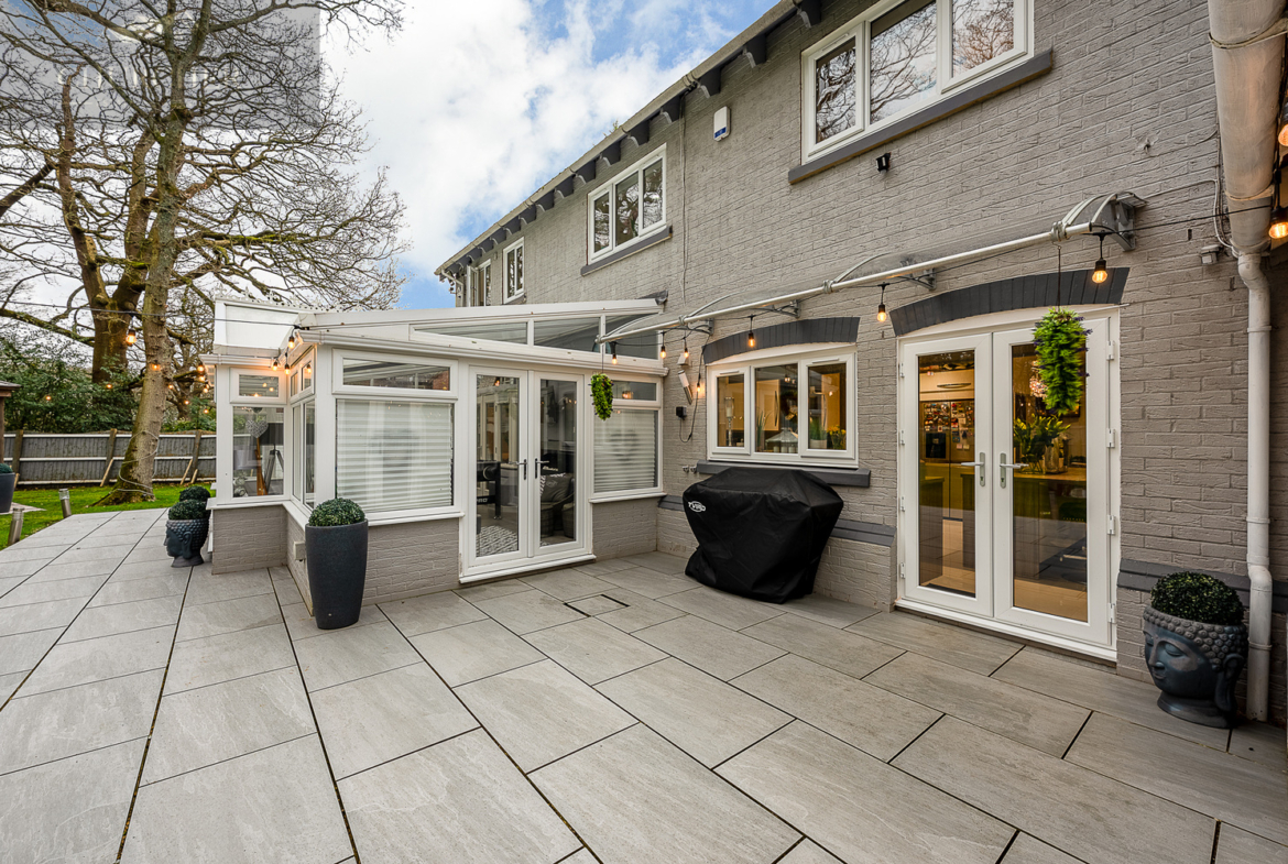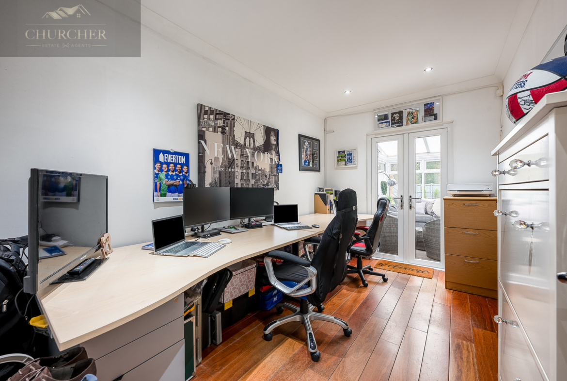 Beyond the kitchen, the property further benefits from a superb garden room positioned to take full advantage of the tranquil outlook. Surrounded by glazing and filled with natural light, this impressive space offers exceptional versatility and is currently arranged as a relaxed sitting area with direct views across the lawn and mature trees beyond. With French doors opening onto the patio, it provides an ideal environment for entertaining, hobbies, or simply enjoying the peaceful surroundings throughout the year.