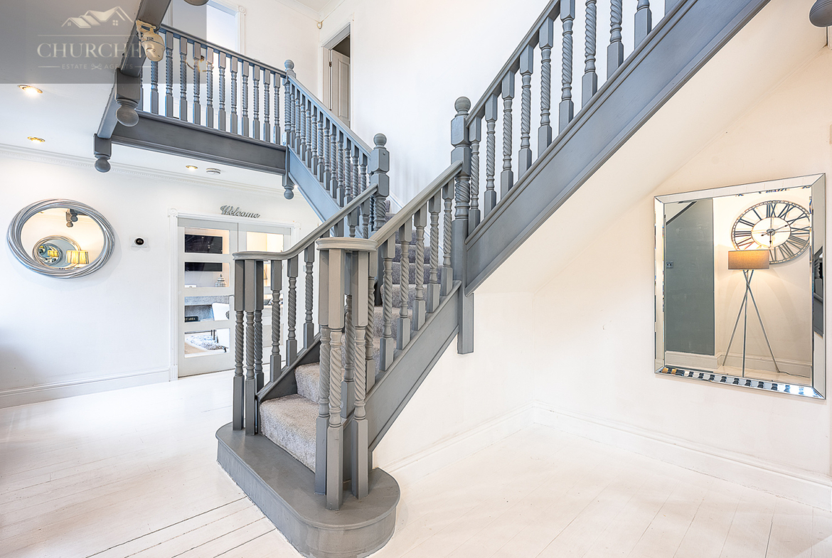 Upon entering, you are welcomed into a bright and spacious entrance hall, where the galleried staircase and tasteful décor create an elegant first impression. The hallway provides a central flow to the main living areas, setting the tone for the space and versatility found throughout the property.