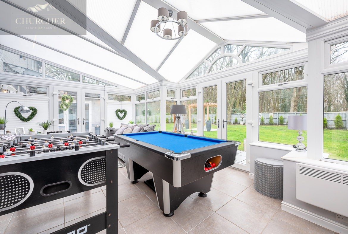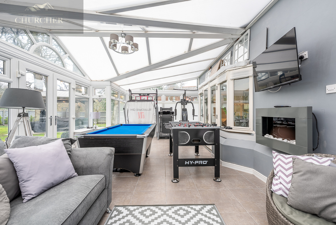 To the rear, the conservatory offers a wonderful extension of the living space. Surrounded by glazing and enjoying tranquil garden views, this versatile room is currently arranged as an entertaining and leisure area, with ample space for seating, games or fitness equipment. It is a bright and uplifting space that can be enjoyed throughout the seasons.