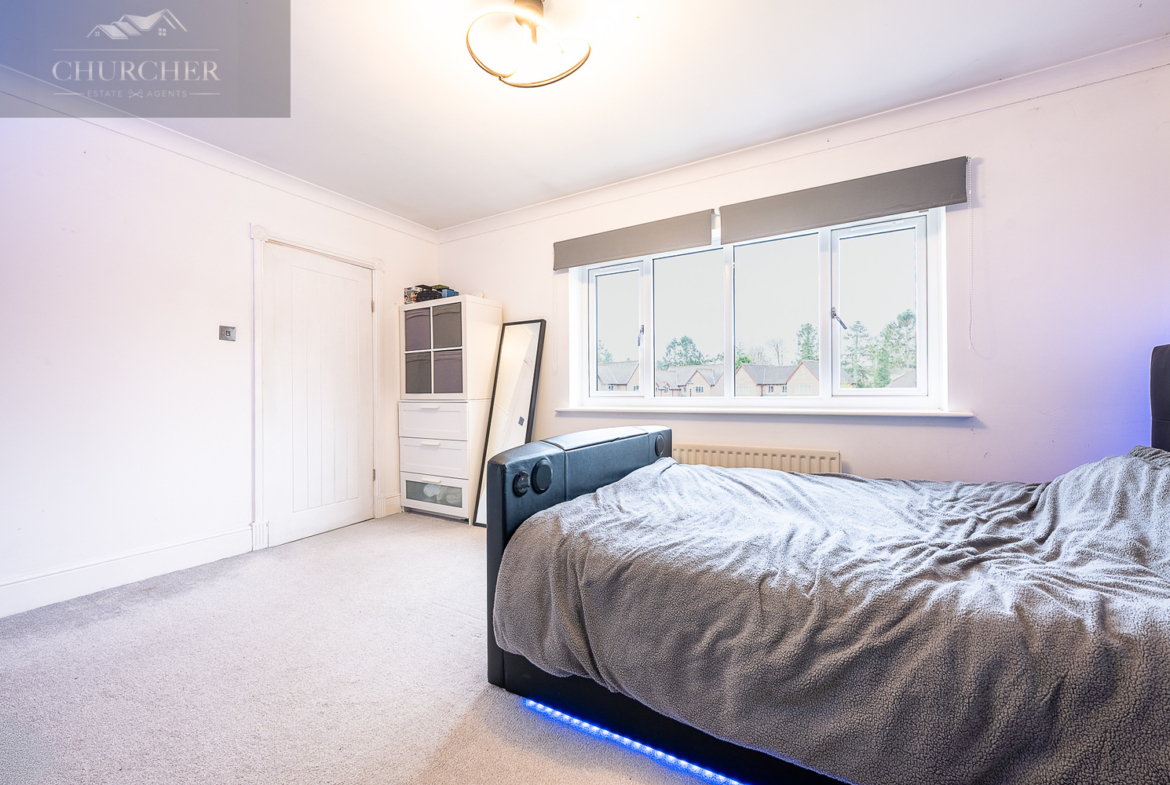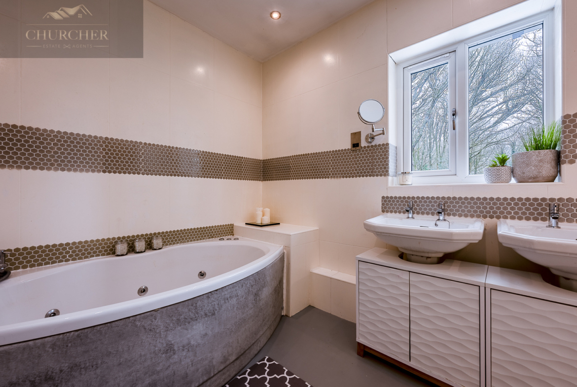 The main bedroom is particularly impressive – an expansive and beautifully presented retreat offering ample space for a king or super king bed, additional seating and fitted storage. Woodland views provide a peaceful backdrop, and the room benefits from its own en-suite facilities, creating a private sanctuary within the home. The en-suite is generously sized and features a corner jacuzzi-style bath, twin wash basins set within vanity storage, and a freestanding shower enclosure, combining practicality with a touch of luxury.