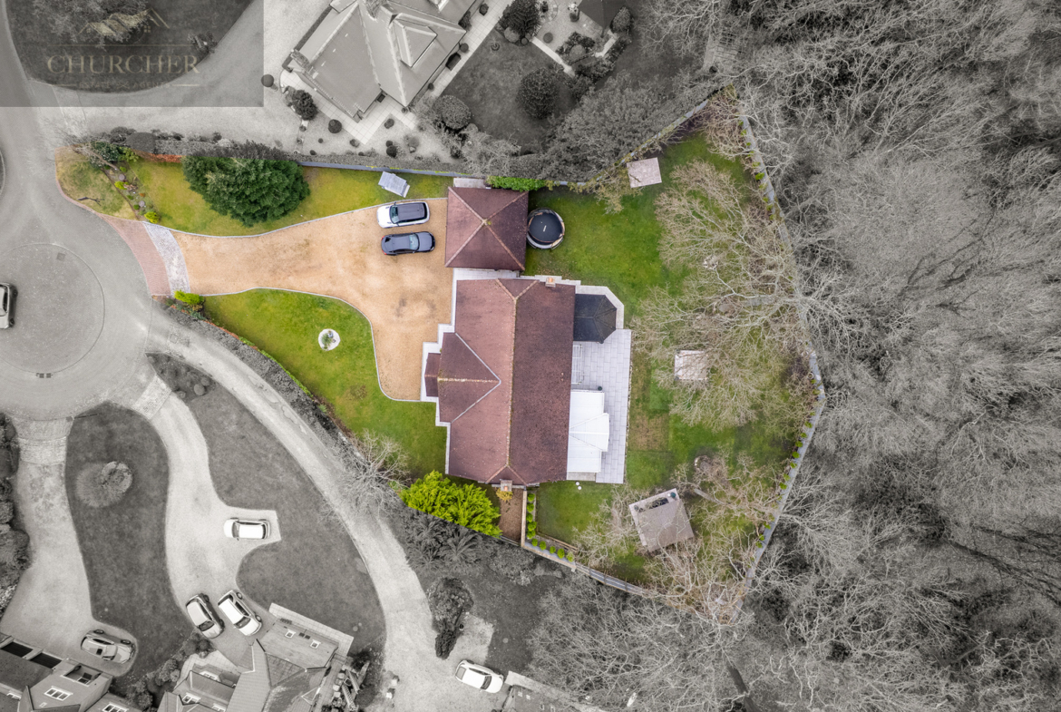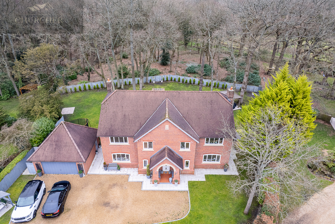 Set back from the road and approached via a sweeping driveway, the property immediately impresses with its commanding presence. Mature greenery frames the frontage, while ample off-road parking and a detached double garage provide practicality to complement the home’s scale. The setting feels private and established, hinting at the generous accommodation that awaits inside.