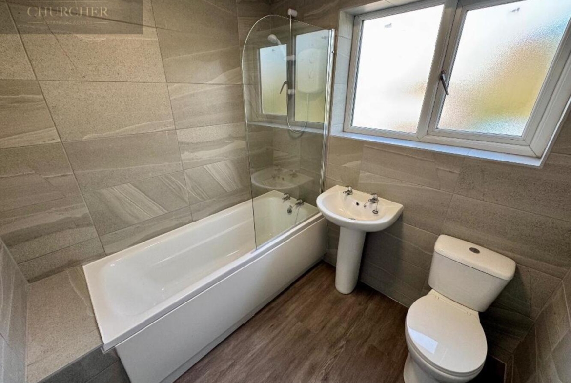 Upstairs, both bedrooms are generously sized, with the main bedroom featuring built-in storage. The modern bathroom has been newly updated and includes a bath with shower, WC, washbasin, and a heated ladder radiator for added comfort.
