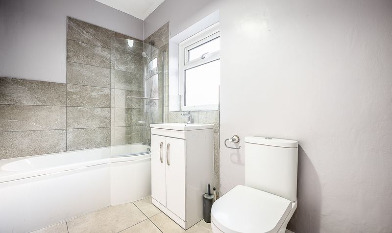 The family bathroom is finished to a high standard, combining modern fittings with a calm, contemporary style. A sleek white suite includes a generous L-shaped bath with a clear glass screen and an overhead shower, offering both practicality and comfort for busy family life. The walls surrounding the bath are beautifully tiled in large stone-effect tiles, adding texture and a sense of luxury to the space. Opposite the bath, a modern vanity unit with under-sink storage provides room for toiletries while keeping the room clutter-free, and a close-coupled WC sits neatly alongside. A frosted window allows for natural light while maintaining privacy, and the soft grey décor ties the whole room together, giving this stylish bathroom a clean, elegant and inviting feel.