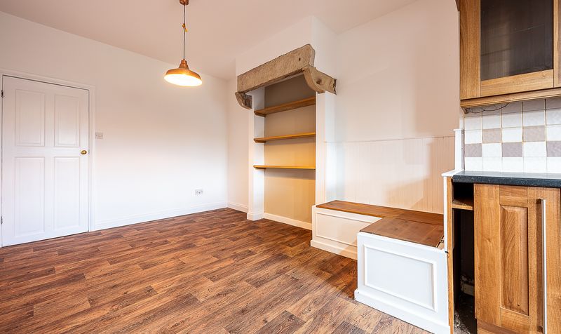 Moving through to the rear of the property, you step into the spacious open-plan dining room and kitchen, a superb sociable space ideal for modern family living. The dining area offers excellent versatility, with attractive wood-effect flooring, built-in seating and shelving, and a view directly into the kitchen, creating a seamless flow between the rooms. This entire area is flooded with light thanks to the large rear window and open-plan layout, making it a superb setting for entertaining or everyday living.