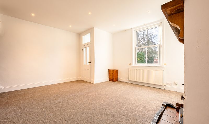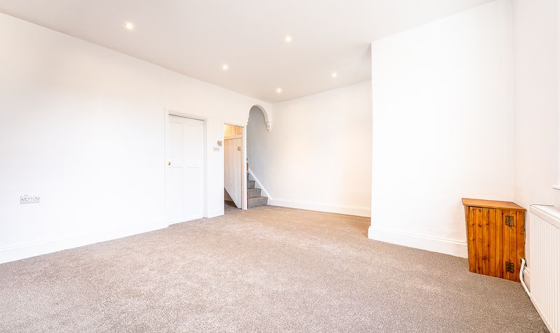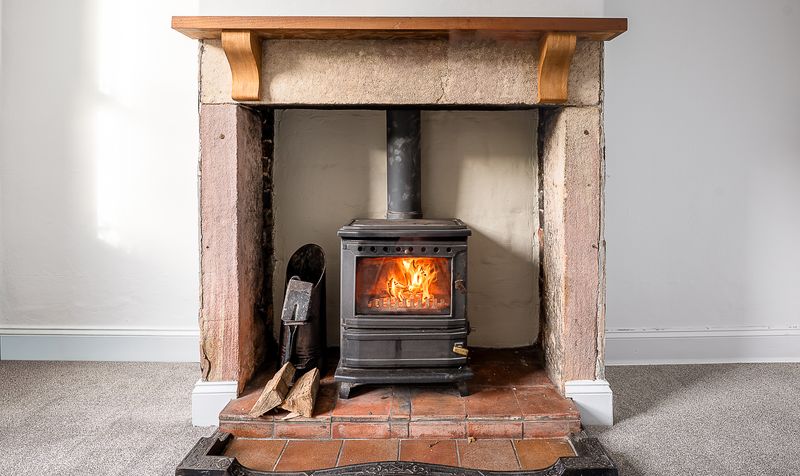 Entering through the front door, you are welcomed into the porch, which leads through into a bright and airy lounge – a beautifully proportioned room bathed in natural light from the large sash-style window. Recently redecorated with soft neutral tones and plush new carpeting, this space feels instantly inviting. The standout feature is the stunning exposed stone fireplace housing a wood-burning stove – a characterful focal point that adds warmth and charm to the room. From here, an elegant archway leads to the staircase, adding further period personality to the home.