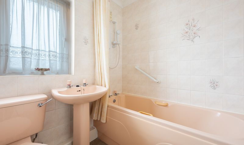 The family bathroom is fitted with a suite including a bath with overhead shower, wash basin and WC, and is finished with tiled walls and a window allowing for natural light and ventilation.