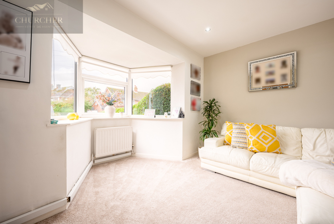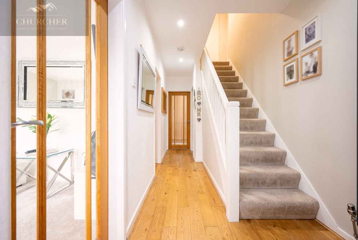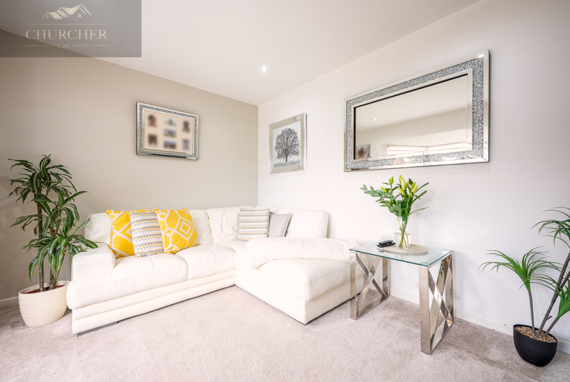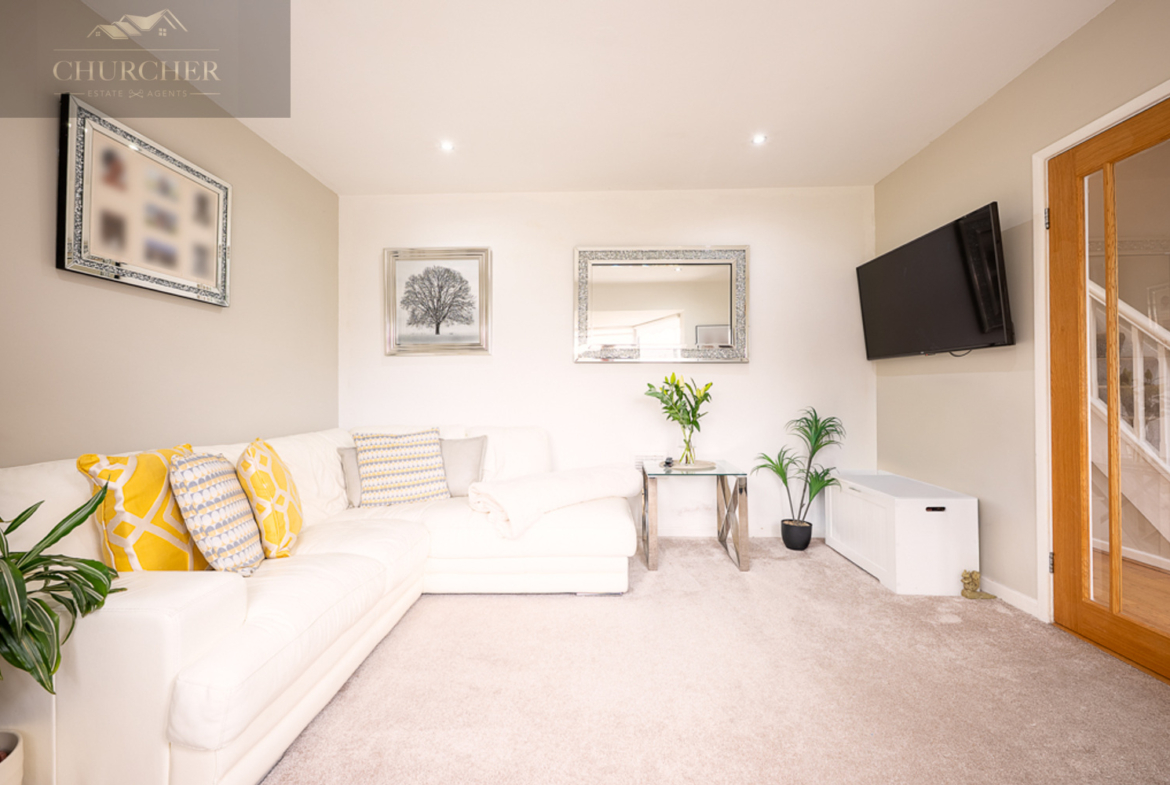 From the moment you enter, you are welcomed by a spacious and inviting hallway, complete with warm wooden flooring, soft neutral décor, and a staircase leading to the first floor. The sense of light and space is immediately apparent, setting the tone for the rest of the home. To the front, the lounge is a bright and welcoming room, with a large bay window allowing natural light to pour in. This relaxing space is tastefully decorated and offers plenty of room for comfortable seating, making it the perfect spot for cosy evenings in with family or entertaining guests. The soft carpeting underfoot and light colour scheme create a calm and airy atmosphere that feels both homely and elegant.
