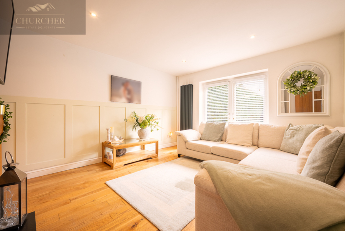 Adjoining the kitchen is a beautiful second reception room, currently used as a family room. With elegant panelling, oak flooring, and French doors that lead directly to the patio, this versatile space can serve as a playroom, a cosy snug, or even a stylish home office. Completing the ground floor is a contemporary downstairs WC finished with quality tiling and a modern design, adding a touch of practicality to this well-planned layout.