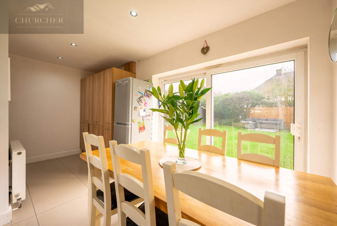 To the rear, the home opens up into an impressive open-plan kitchen and dining area – the real heart of the property. The kitchen features a range of modern units with sleek worktops, integrated appliances, and plenty of storage, ideal for any busy household. The open layout makes this space perfect for entertaining, with ample room for a large dining table and direct access to the garden through wide sliding glass doors. These doors not only fill the room with natural light but also create a seamless flow between indoor and outdoor living, perfect for summer gatherings or relaxed family mealtimes overlooking the garden.