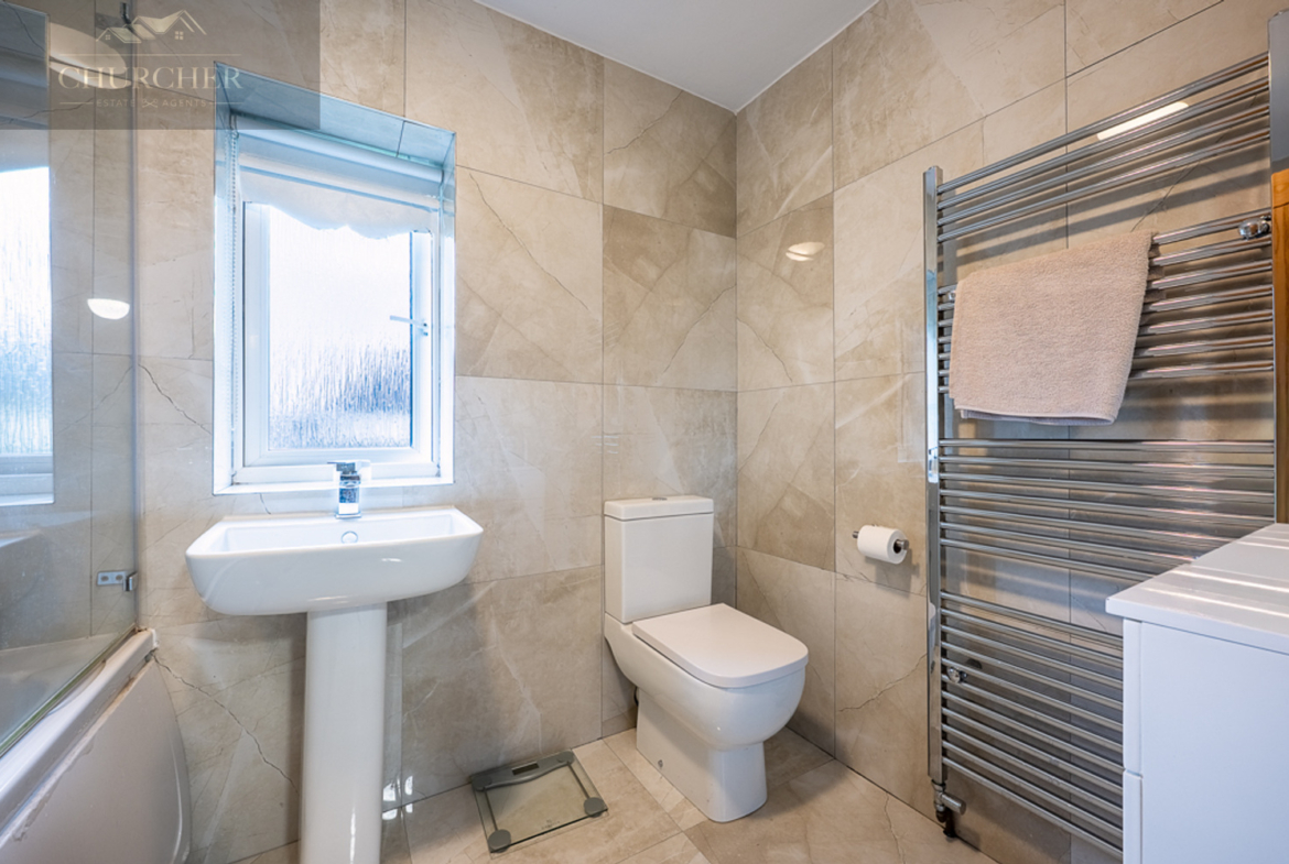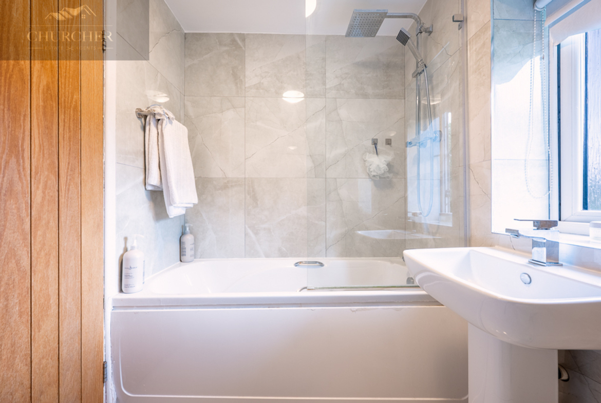The family bathroom is finished to a high standard, complete with stylish tiling, a modern white suite, and a rainfall shower over the bath. This space perfectly blends functionality with style, providing a peaceful place to unwind at the end of a long day.