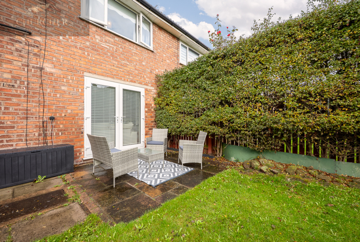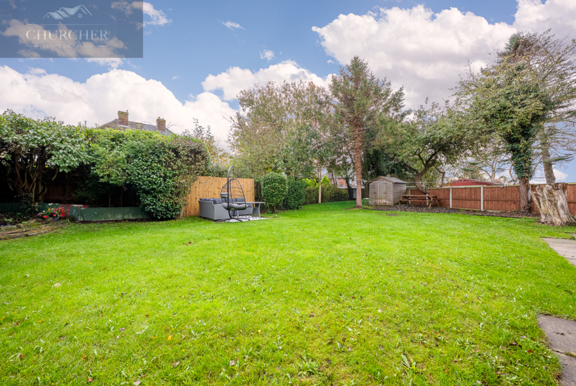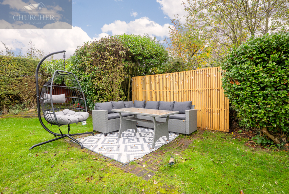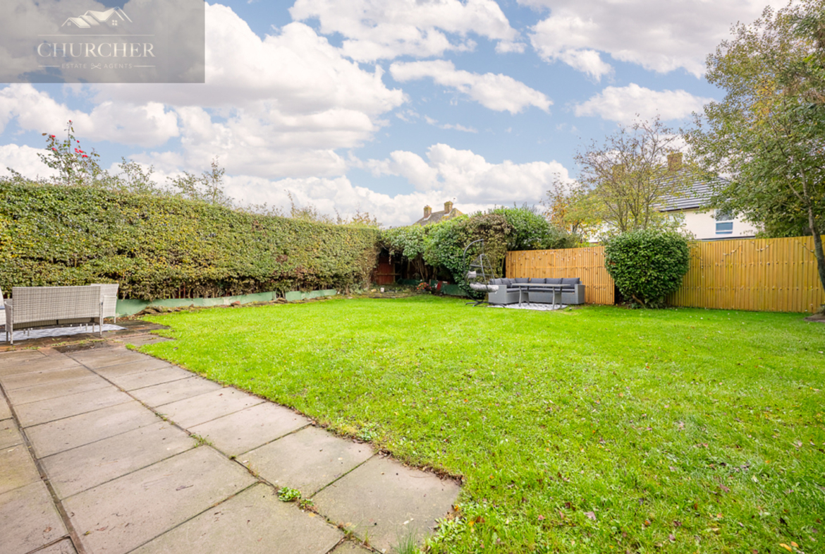 Externally, the home continues to impress. To the front, there is ample off-road parking on a neatly laid driveway, complemented by a lawned garden and mature hedging that enhances privacy. To the rear, the property boasts a truly wonderful garden – a generous, family-friendly space mainly laid to lawn, bordered by established trees and shrubs. It offers the perfect environment for children to play safely and for adults to relax or entertain. With two defined patio areas, there’s space for outdoor dining, seating, and summer barbecues, making it a superb extension of the home during the warmer months.