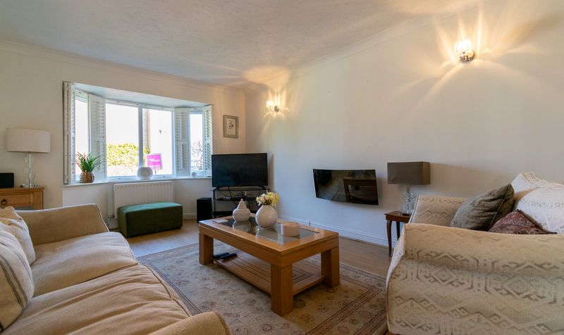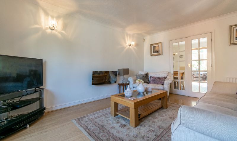 The formal lounge, located at the front of the property, offers a cosy yet stylish space ideal for both relaxing and entertaining. A large bay window fitted with bespoke shutters fills the room with natural light, enhancing the feeling of space and calm. The décor is tastefully neutral, with wood-effect flooring and chic wall-mounted lighting, while a modern inset feature fireplace creates a comfortable focal point. French doors lead through to the dining area, creating a seamless flow perfect for social occasions. To the front of the home, a versatile ground-floor office provides an ideal workspace for remote working, complete with built-in shelving and generous desk space.