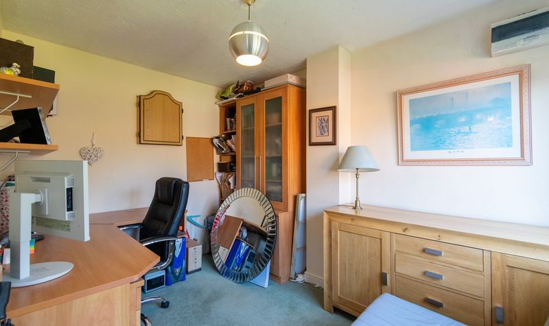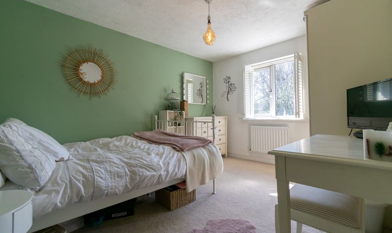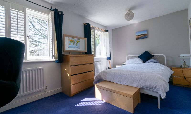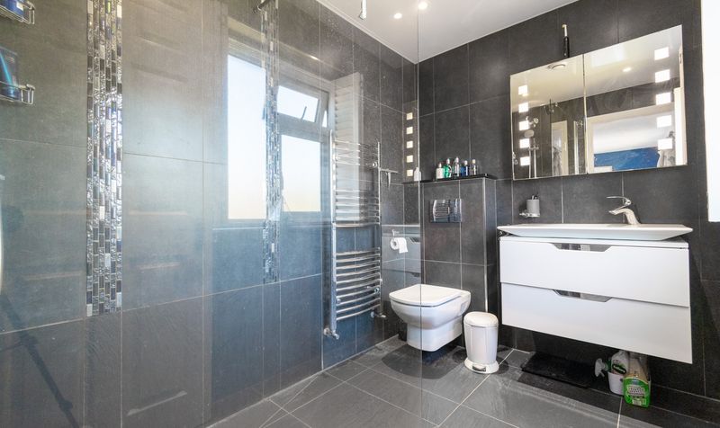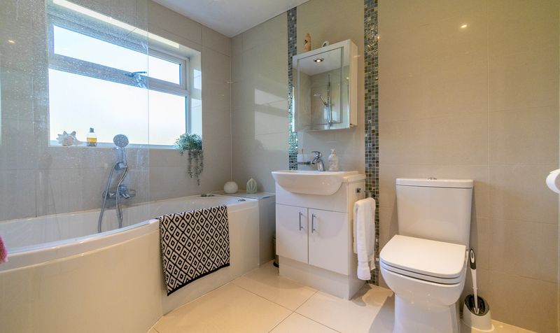Upstairs, the home offers three generously sized double bedrooms and a single bedroom. One of these has been extended by removing a stud wall to create an exceptionally spacious room, though it could easily be returned to a four-bedroom layout if desired. The principal bedroom benefits from a private en-suite, and the stylish family bathroom features contemporary tiling, a sleek curved bath with overhead shower, vanity unit with built-in storage, and a low-level WC.